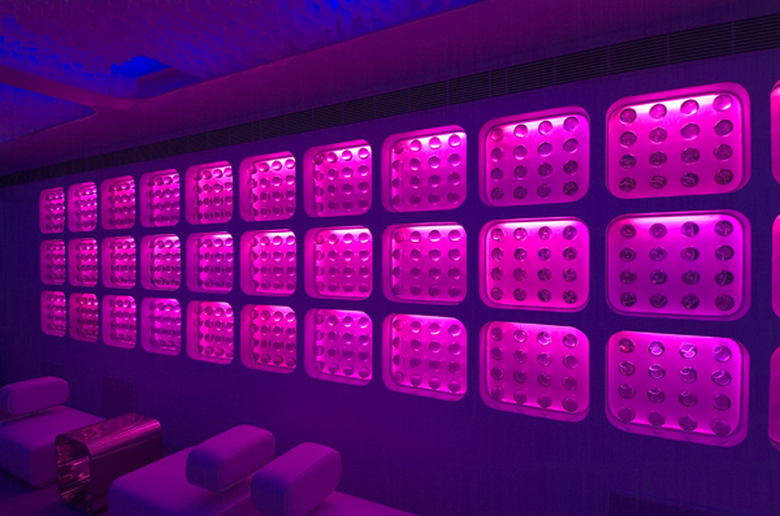 A wall of repetitive niches is one of the highlights of the space. 900 individual balls cast out of a transparent composite resin, float within niches backed with sandblasted acrylic. LED lighting concealed behind the sand blasted acrylic gets preset to a colour of choice. The light filters through to the transparent balls creating luminosity and multiple reflections within the spheres.