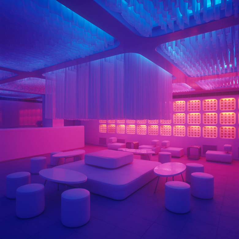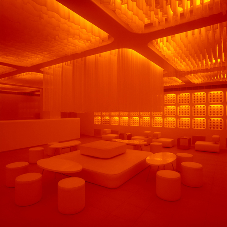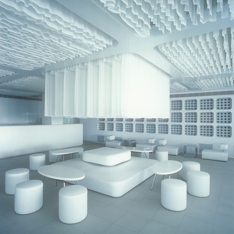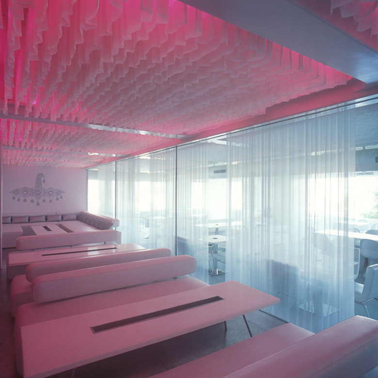 A mundane and particularly uninspiring ceiling with a grid of heavy beams was turned into the most dynamic design feature of the space. Rather than close the ceiling with a false ceiling, the designers suspend thousands of metres of sheer white chiffon fabric vertically from the ceiling till the beam bottom. LED lighting is entirely concealed above the folds of fabric within the ceiling, and filters through the millions of folds of sheer white fabric giving the entire ceiling a feeling of sensuality, haunting depth, fluidity and transparency.