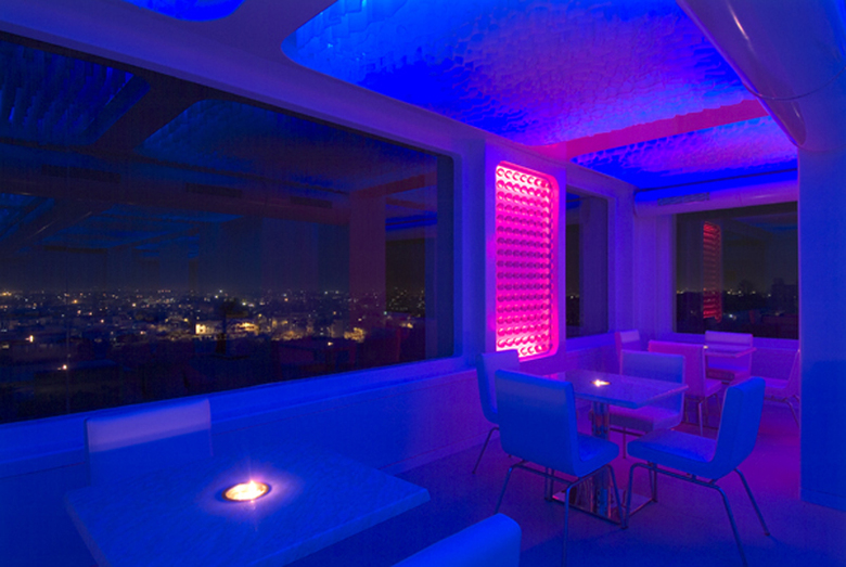 We conceived of the space as a dynamic white shell, that would have the ability to transform itself according to the moods of its users. Sophisticated lighting technology allowed us to see this concept through. Thousands of light emitting diodes (LED’s) are concealed within the space and have the ability to change (by means of a pre-programmable software) from calm and contemplative colours to more saturated and hyper colours. The palette and colour wheel is unlimited, and is controllable with the touch of a button. Colours are preset, or otherwise set by sensing the overall mood of the users. The LED lighting, integral to the concept of the project has been possibly used to the first time in India in this manner- an approach that allows a space to have a life of its own.