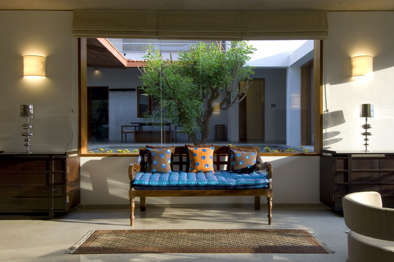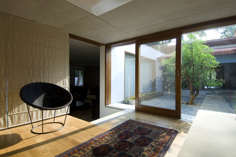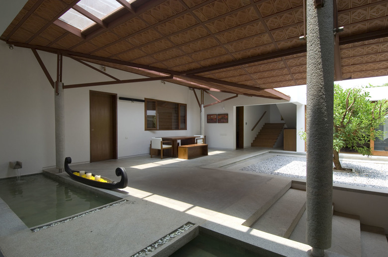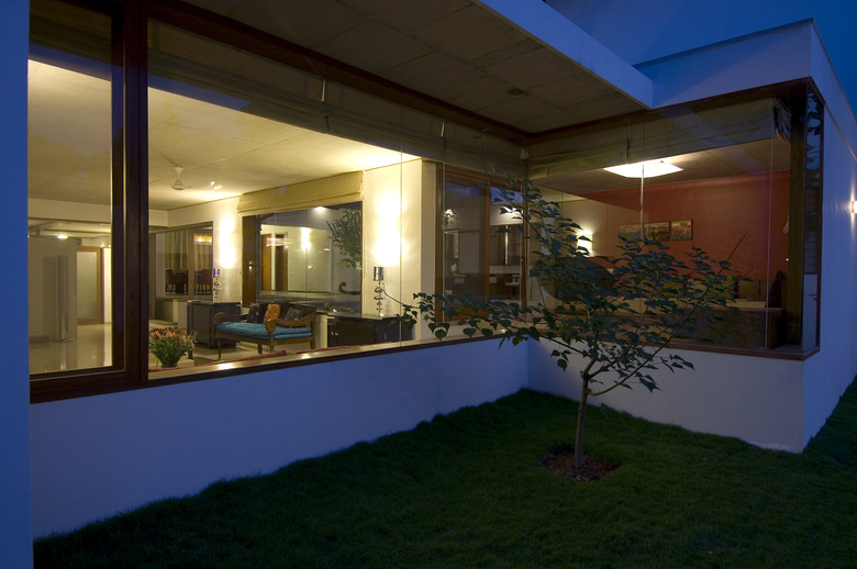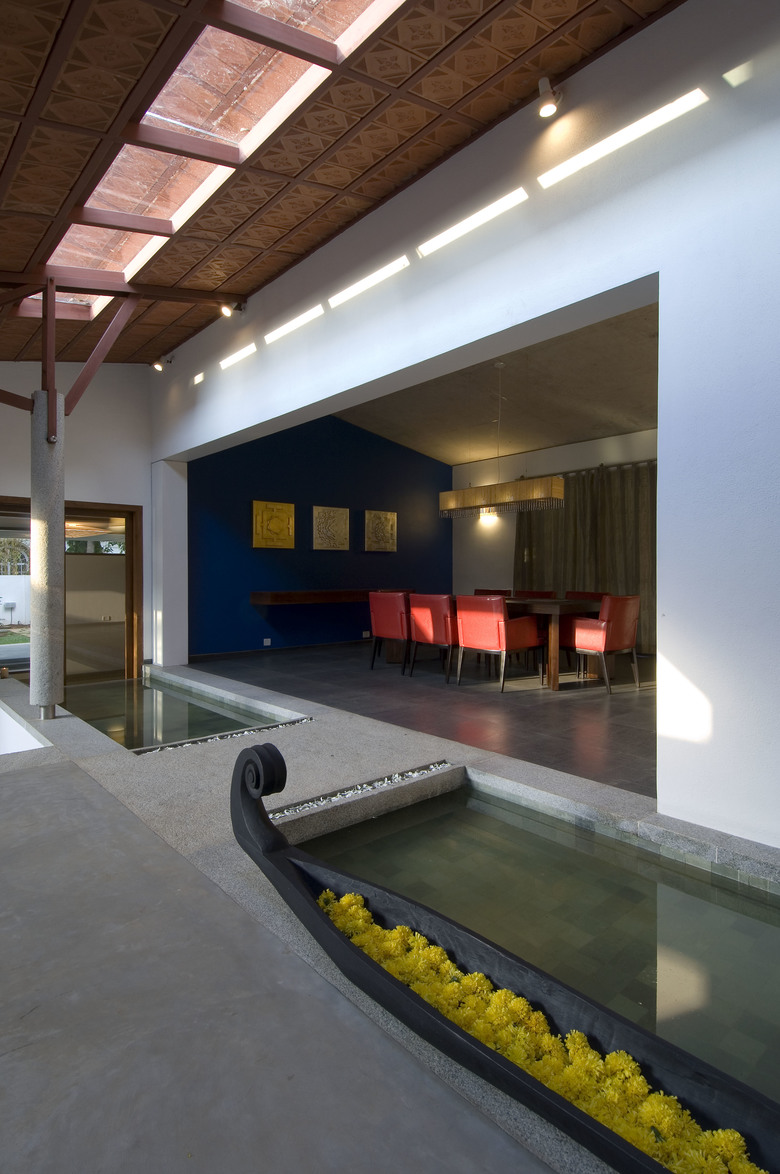 Our approach was to respond to the traditional science, extract its essence yet arrive at a fresh and innovative interpretation of the same. The house, built on gentle split-levels ascends lazily from north east (the lowest point) to the southwest (highest point). Its linear horizontal lines and vast cantilevered roof forms weave around the resident trees, and large expanses of glass blur the spatial boundaries between the garden and the house. One experiences a sense of infinity while walking though the open plan of the living spaces, which are demarcated from one another by sliding, bi-fold doors and in some cases no barrier at all. The house has two entrances. The private one faces a serene residential lane and the other looks on to a noisy main road. The house is located near the quiet lane, and the home – office is located near the main road. The home office acts as a sound barrier and while one is in the house nestled within an almost unbroken canopy of old trees one cannot perceive the cacophony of the main road. Instead of having conventionally demarcated spaces, the house spontaneously responds to its surroundings by choosing to dwell upon lovely views from strategically placed rooms. A linear hand chiseled stonewall and a low water body finished in lime green slate leads to the intimate foyer. A solid wall of Quera granite separate it from the living area. The informal intimate lounge area connected by a small flight of stairs with the living space faces a serene courtyard but also enjoys views of the garden and a vast lily pool. Large bifold doors open the living room into the open court, where gentle steps chiseled out of local quera granite lead you to an open to sky courtyard with a single ornamental tree perched in its centre. The verandah surrounding the internal courtyard has a sloping vernacular Mangalore tiled roof. The column supports for this roof are innovative. Load is transferred via large diagonal steel struts onto the hand chiseled stone columns. An outdoor dining table takes advantage of the temperate climate of Bangalore where living and dining in semi –outdoor spaces can be more pleasurable than sitting indoors. The dining area is separated from the court by a channel of water flowing from south to north. The Vastu house is climate sensitive and takes advantage of Bangalore’s temperate climate all year round. Large overhangs combat the fierce monsoons; the southwestern facades of the house are shielded from the fierce summer sun, with the north side completely transparent to the property’s lush tropical foliage. In every space there is free movement of air and light. A flight of wooden stairs leads you from the courtyard to the Master Suite on the first floor. The Master Suite has a large sit out, an attached gym, walk in closets and a courtyard bathroom filled with natural light. There is an interesting mix of luxe and natural elements in the Vastu house – rough stone steps, pebbled courts, exposed concrete ceilings and polished cement floors contrast well with polished Italian marble, fine teak furniture, velvets and silks. The predominantly white facades of the exterior are broken with select walls in rough hewn stone while some interior accent walls are deliberately punched out in saturated Indian colours – deep magenta, orange and neel blue. The garden with a lap pool on one side has an outdoor dining area with a 15ft rough-cut log as the table. Here one can dine under the giant banyan tree with layers of tropical planting surrounding you.