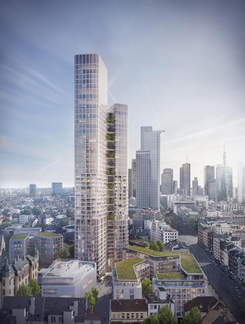 Die Präsidiumstürme öffnen ihre Flügel mit einladender Geste zur Friedrich-Ebert-Anlage. Ihre schlanke, elegante Gestalt basiert auf der Gliederung des Volumens in einen hohen Turm mit größerer Grundfläche und einen kleineren, niedrigeren Turm. Leicht geknickte Flügelkanten verkürzen optisch die Fassadenlängen und lassen ein schönes Schattenspiel entstehen. Die stark skulpturale Wirkung der Türme wird durch die gerundeten Gebäudeecken verstärkt. Die Fassadengestaltung lässt in ihrer Selbstverständlichkeit der expressiven Skulptur der Gebäudeform den Vorrang.