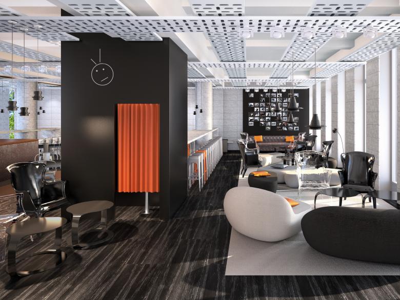 Tables in the restaurant area to be coated with board (blackboard) lacquer with option to leave messages on the tables. Bistro atmosphere is created by traditional french metal bistro chairs in silver colour. Meeting Point: High tables with bar stools offer the opportunity to get in contact to the other guests. Seating bench with little tables give opportunity to sit and eat. Large Baxter sofa with Chesterfield covering in silver. Lounge area with large seats (“Flirtstones”) and plastic armchairs in black and white (transparent). Materials: black wooden floor , walls and ceiling left in construction style only white painted, to contrast to the black floor; creating atmosphere in selected areas by rgb lights; the wall behind the large Chesterfield sofa are printed with poems in blue coloured graffity style; change in floor material in the reception/buffet area to tiles (size 60/60 cm). Columns painted with Caparol prime coating. poster advertising art: a wall covered with multiple layers of large poster advertising, by ripping pieces of the posters the occasional artist can create a new artwork. Show kitchen with large window. Reception and buffet in the same area and made of the same fixture element, the different areas are defined by varied surfaces and materials. Advertising column: possibility for the guest to leave messages and to get information about the city and the hostel. Digital picture frames on the black painted wall above the chesterfield sofa to show different pictures and to give the possibility for the guests to show their own pictures (if possible with data privacy protection)