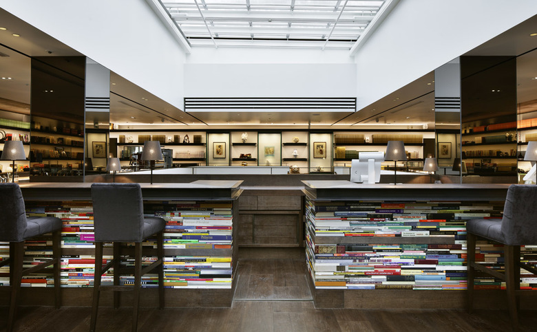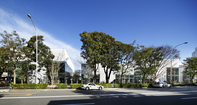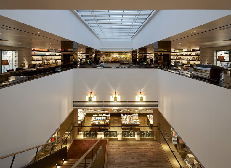 Other facilities include a café, an upscale convenience store, and the Anjin lounge, where visitors can browse a library of classic design magazines and books or peruse artworks for sale as they eat, drink, read, chat, or relax. Externally, KDa’s characteristic wit emerges in subtle ways – the perforated screens of the façade are formed from the Ts of the Tsutaya logo, and much larger T-shapes are disguised in the building plans and elevations.