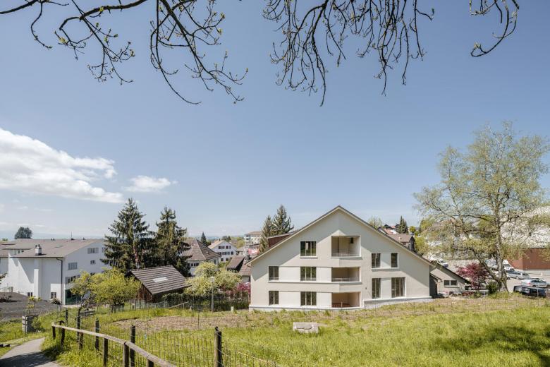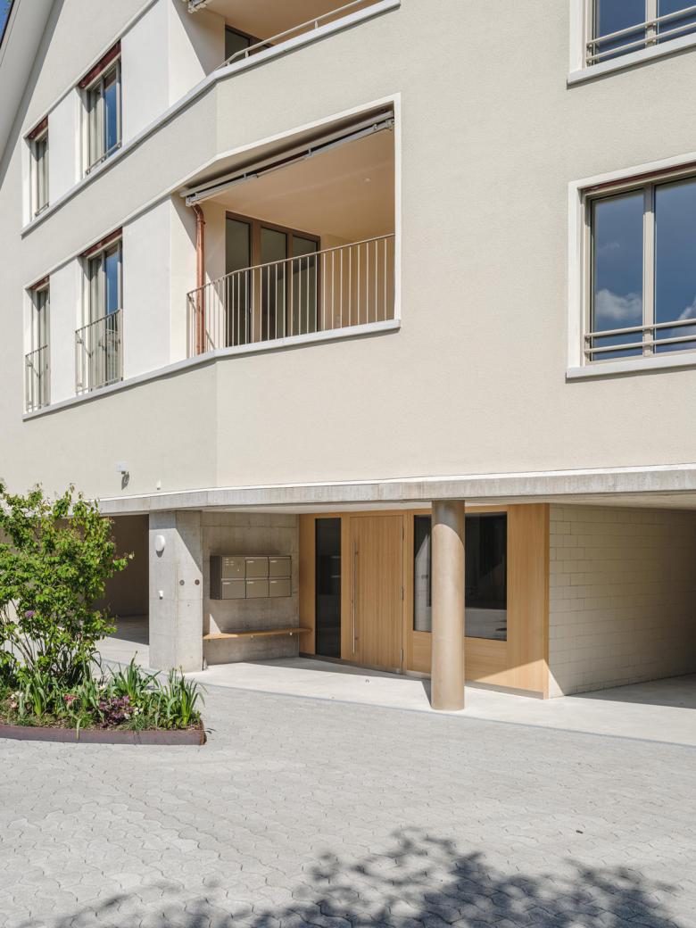 Mit der Neusetzung des Ersatzbaus konnten die Abmessungen des Hofes etwas vergrössert werden. Mit dem rhomboiden Volumen konnte die Besonnung des Hofes und die Ausrichtung der Wohnungen gegenüber dem Altbestand wesentlich optimiert werden. Auf Hofniveau befinden sich Hauptzugang und Parkierung. Mit halbversetzten Geschossen wird auf die steile Topografie reagiert. Die Wohnungen reihen sich aufsteigend um das zentrale Treppenhaus bis ins Dachgeschoss. Entsprechend hat trotz der Hanglage jede Wohnung über drei Fassaden Ausblick ins Grüne und zum Ortskern.