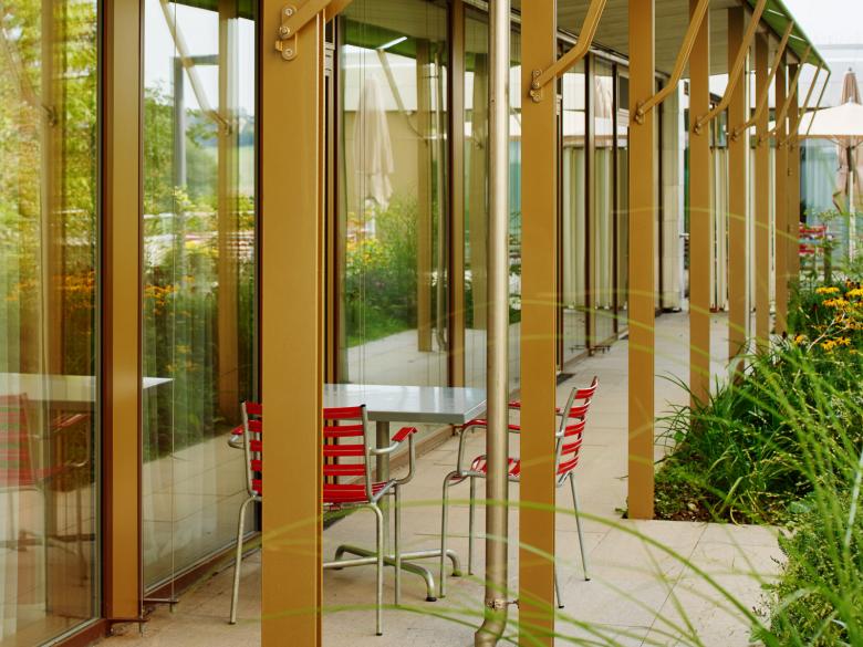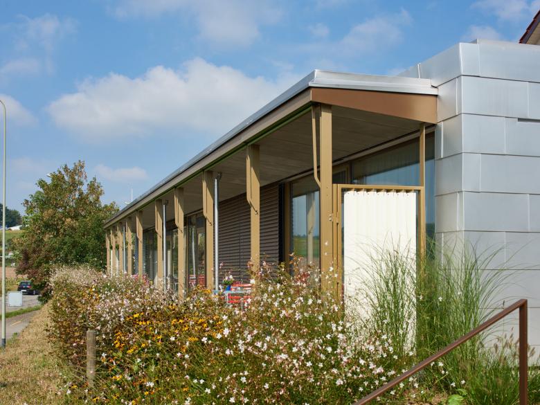 Der Erweiterungsbau schliesst als eingeschossiges Gebäude an einen bestehenden Massivbau an. Grossflächige Fensterpartien vor den Zimmertrakten und die geschuppte Aluminiumverkleidung der geschlossenen Fassadenflächen verleihen dem Neubau einen pavillonartigen Ausdruck. Er setzt sich dadurch präzis vom zweigeschossigen Altbau mit bestehendem Satteldach ab und ermöglicht eine klare Zonierung des Aussenraums in zwei stimmungsvolle Hofräume.