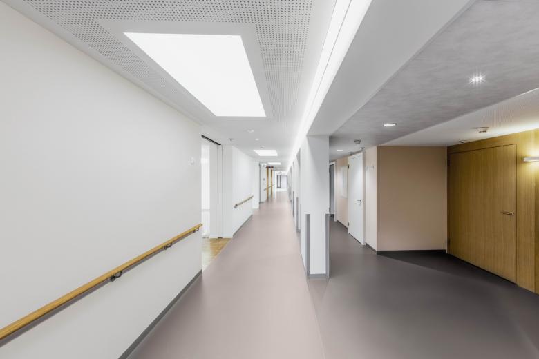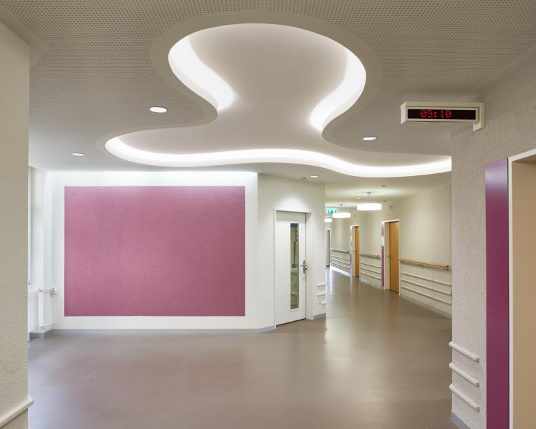 Der Umbau und die Erweiterungsarbeiten im Haupthaus sind grösstenteils innenräumliche Veränderungen, welche eine Neukonzeption bezüglich Funktion und Gestaltung des Restaurants beinhalten. Mit dem Einsatz von zeitgemässen Materialien und Leuchttechnik wird eine neue und dem Pflegezentrum adäquate Identität geschaffen.