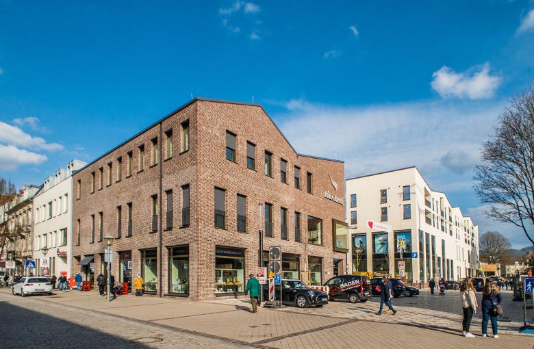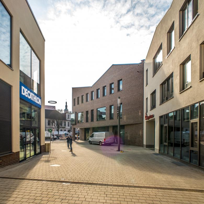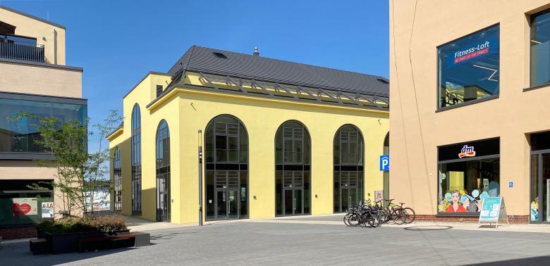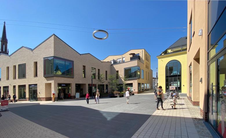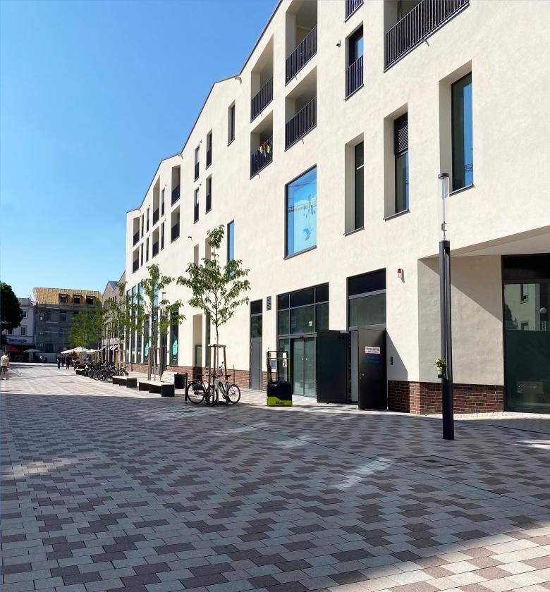 Das Entrée zum Stadtquartier bildet die Fortführung der Fußgängerzone der Hauptstraße und eröffnet den Blick auf die Stadthalle. Am Kreuzungspunkt dieser Hauptbeziehungen entsteht als zentraler Anlaufpunkt der öffentliche Quartiersplatz vor dem Gebäude der Stadthalle. Diese wurde im Zuge der Quartiersentwicklung saniert oder in Anlehnung an das historische Vorbild neu errichtet. Der Portikus wurde erhalten, saniert und in den Neubau integriert.