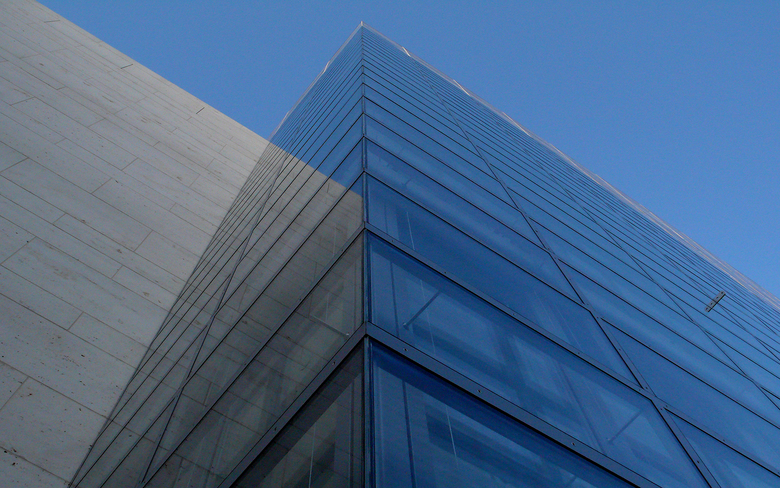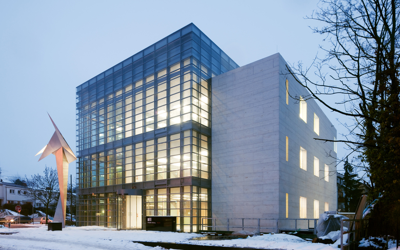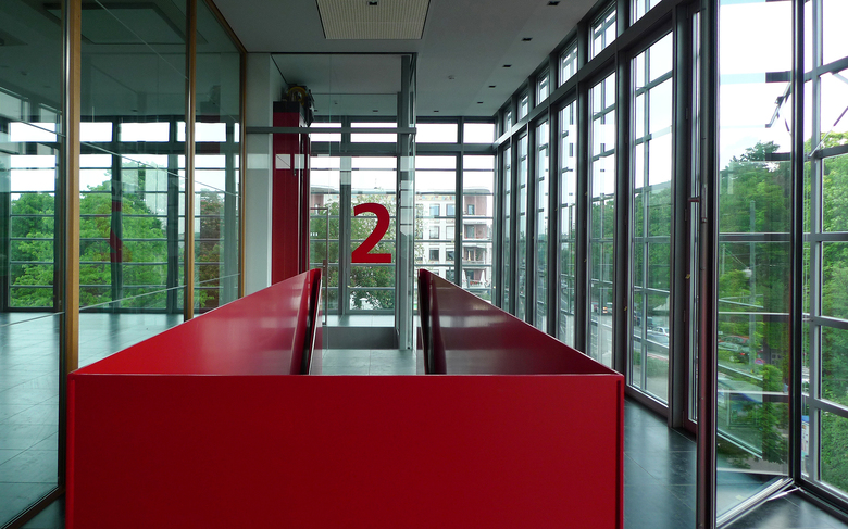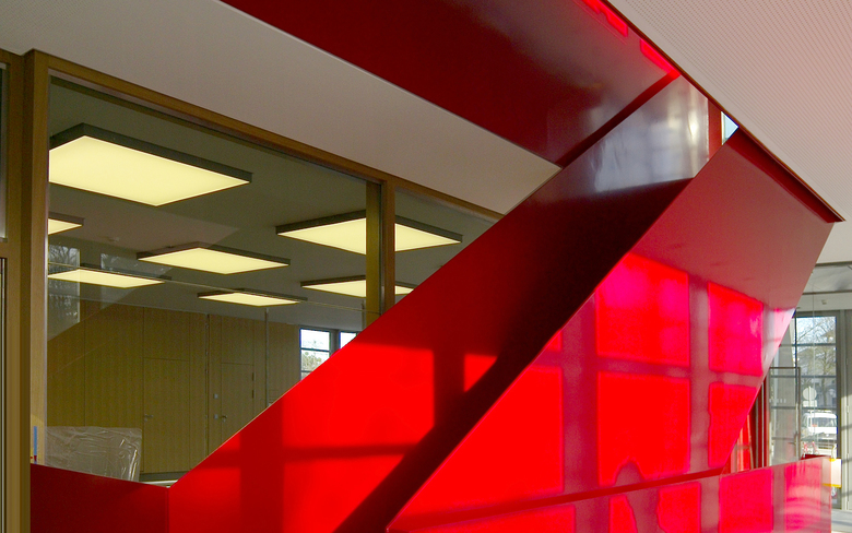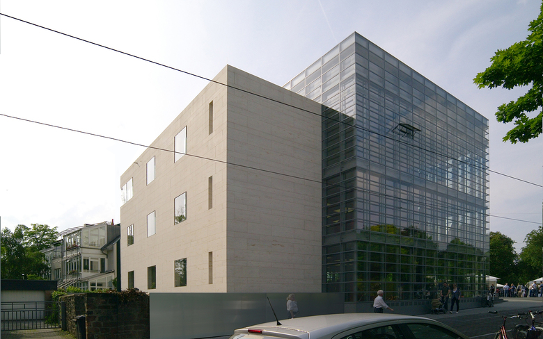 Das Schader-Forum in Darmstadt Bessungen bildet ein eigenständiges Bauvolumen, das sich in der Abfolge der vorhandenen Solitäre Stadthaus und Wilhelminenstraße 50 als weiterer Solitär in das vorhandene Gebäudeensemble einfügt. Dabei wird das Gebäude aus zwei sich verschneidenden Kuben gebildet: Im Vordergrund ein gläserner Kubus, der von einem steinernen Winkel in den Griff genommen wird. Der „Steinwinkel" bildet das Rückgrat des neu zu gestaltenden Platzes und beherbergt die Büro- und Besprechungsräume sowie die Nebenräume. Der Glaskubus wird als offene Struktur mit flexibler Nutzung und den vertikalen, farblich abgesetzten Erschließungselementen Treppe und Aufzug ausgebildet.