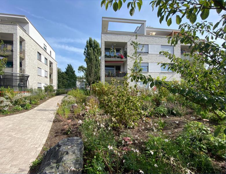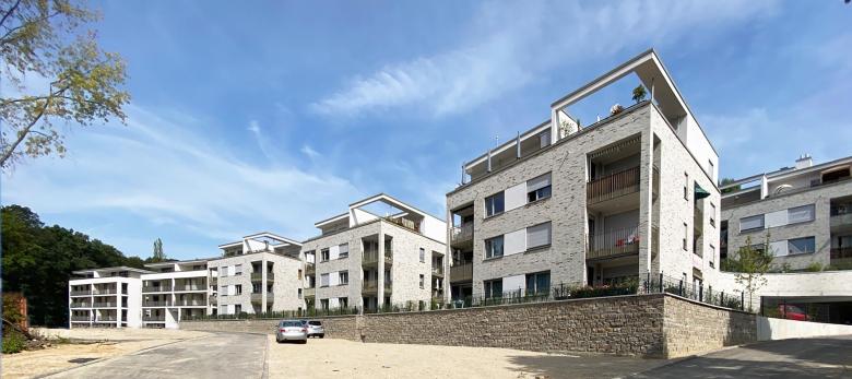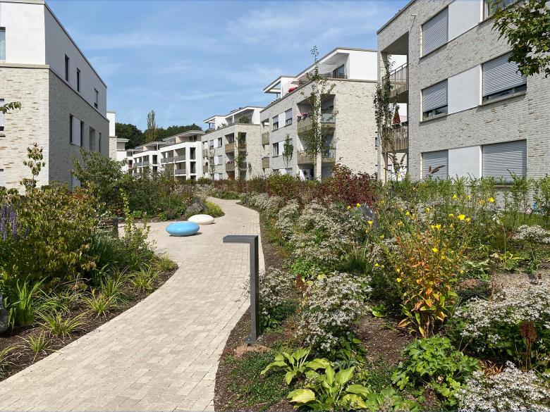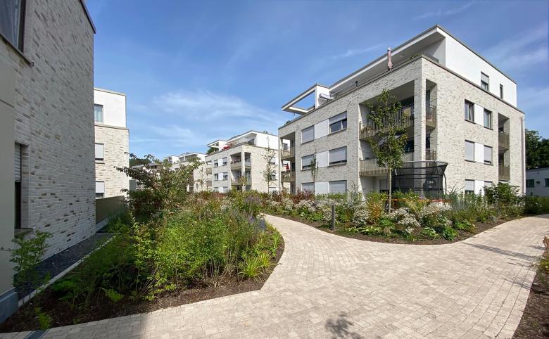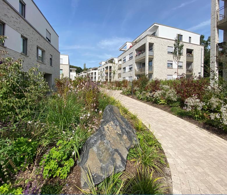Der natürliche Höhenunterschied auf dem Gelände von bis zu 6 m wurde durch die geschickte Anordnung der Solitäre in unserem Entwurf genutzt, um Ausblicke aus nahezu jeder Wohnung ins Tal zu ermöglichen. Eine Natursteinmauer nimmt den Geländeversprung auf und fungiert als Lebensraum für Mauerechsen. Die zu den Wohnhäusern gehörigen Freiflächen haben wir als private Grünbereiche mit parkartigem Charakter konzipiert, wobei der südliche nicht unterkellerte Bereich zukünftig eine Versickerung des Oberflächenwassers ermöglicht.“