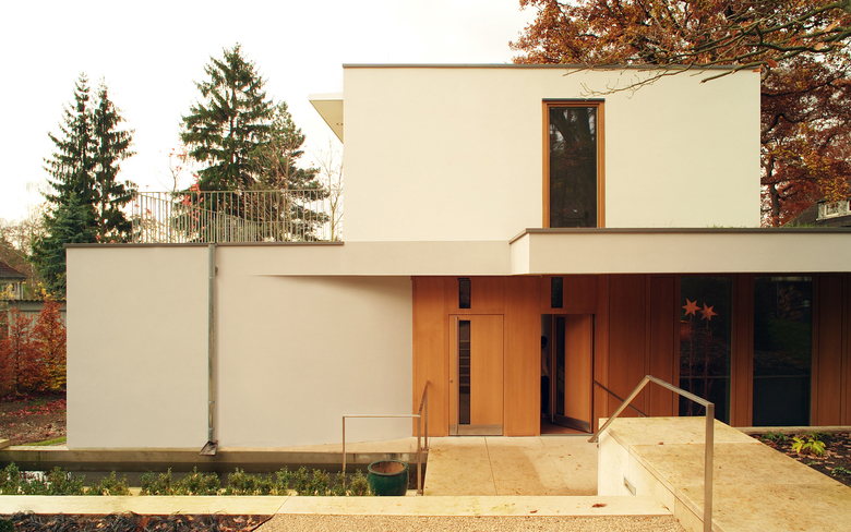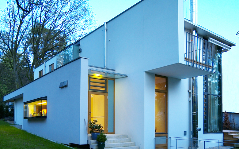 Der Neubau des Wohnhauses entstand 2004-2006 in der „Waldkolonie“ in Darmstadt-Eberstadt. Diese ist eine gelockerte Siedlungsstruktur aus den 20er Jahren inmitten von altem Baumbestand. In dem vorgegebenen Baufeld entstand ein Wohnhaus für ein berufstätiges Ehepaar. Für die gemeinsamen und die Einzelinteressen wurde das Konzept eines Hauses entwickelt, in dem die Privatheit des gemeinsamen Wohnens ebenso garantiert ist, wie die geforderte Intimsphäre der Arbeitsbereiche. Dies bedeutete eine gemeinsame Adresse jedoch zwei gleichberechtigte Eingänge. Rückzug der Bewohner in ihre privaten Räume sowie Wahrnehmung der gemeinschaftlichen Interessen in einem großzügigen Wohn-, Ess- und Küchenbereich sollten gewährleistet sein.
