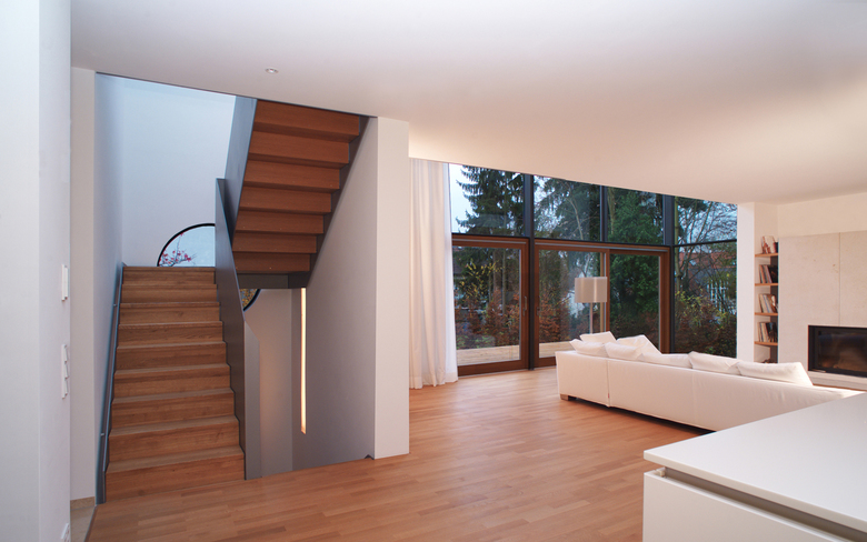 Da das Grundstück nicht sehr groß ist und zwei alte Eichen erhalten werden sollten, war für die Grundriss-Konzeption klar, dass der Außenraum Bestandteil des Innenraumes ist; daher der offene Grundriss – der fließende Raum von innen nach außen.