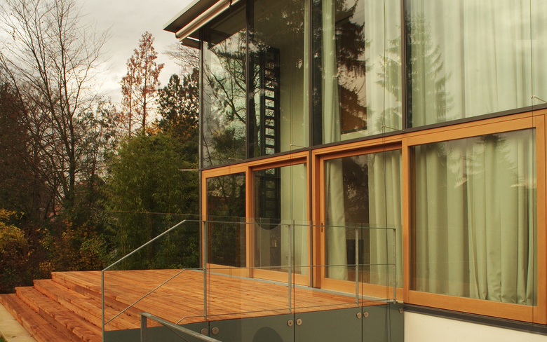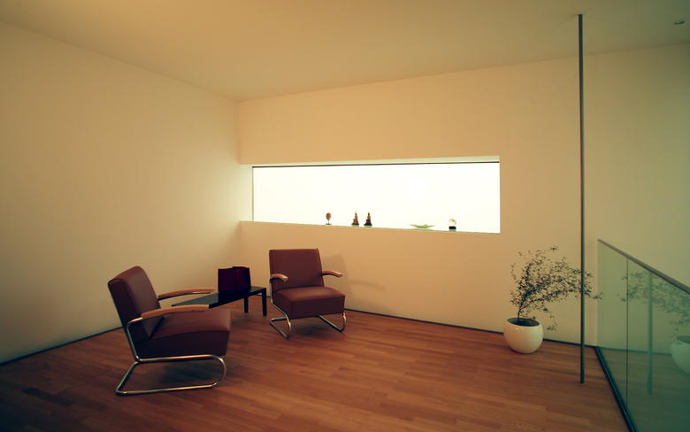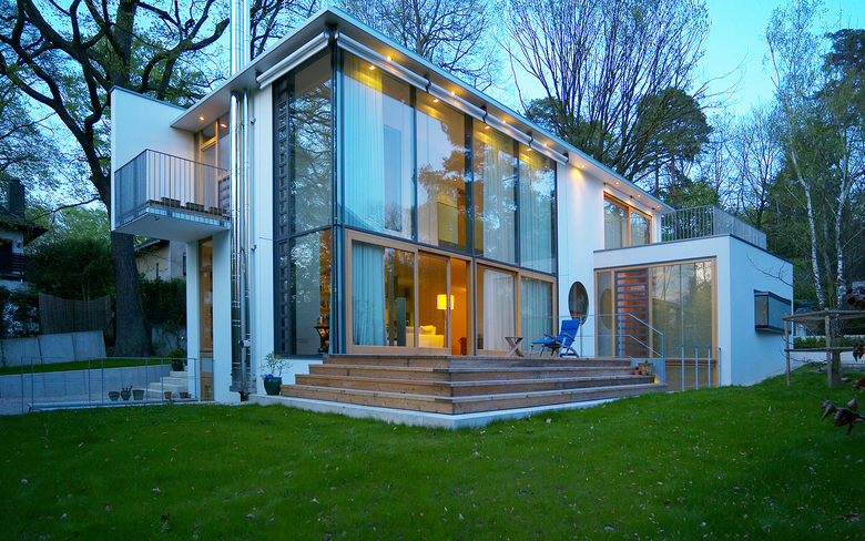 Ebenso war wichtig, das Gebäude nach Süden über große Glasflächen zu öffnen und nach Norden mit kleinformatigen Fensteröffnungen eher geschlossen zu halten. Das Gebäude entspricht dem Niedrigenergiestandard, was durch entsprechende U-Werte der Haut und der Fenster-Fassadenkonstruktion gewährleistet ist. Der Wohnbereich ist im EG, der Schlaf- bzw. Rückzugsbereich organisiert sich über das 1. OG. Der räumlich abgetrennte Arbeitsbereich beinhaltet das EG und das UG mit einem zugeordneten Meditationshof. Dieser Bereich ist eher introvertiert und erhält seine Intimität durch seine Orientierung nach Westen (Straßen abgewandte Seite) und seine innere Raumorganisation.