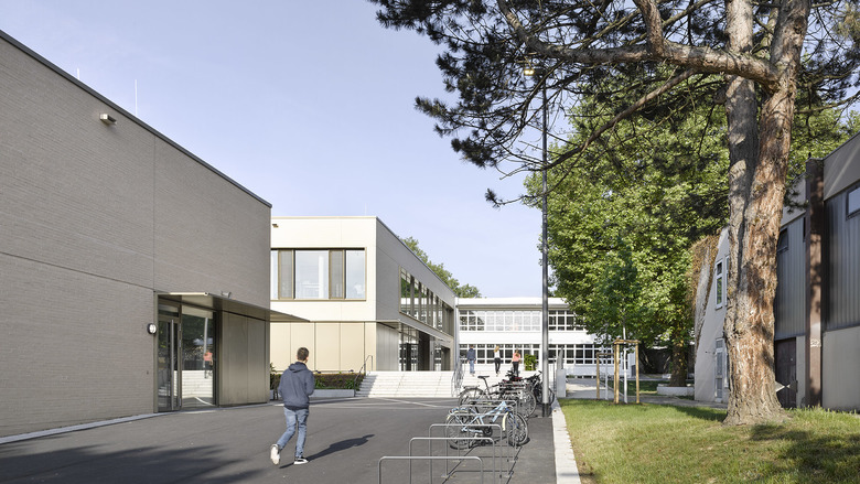 The two existing buildings - the "tower houses" - remain on the site. The new building, which is placed between them, not only completes the overall urban concept, but also represents the functional link. The new construction of the sports hall also deliberately fits into the building sequence and supports access to the school complex.