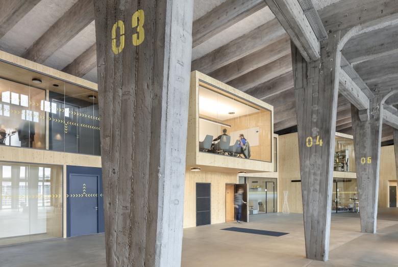 Das Ensemble ist in drei ebenerdige Baukörper gegliedert, die als großräumige Hallen kreissegmentartig angeordnet sind. In dem kathedralartig ausgebildeten Mittelbau befindet sich das 2geschossige Innovatorium, das öffentliche Veranstaltungen für 400 Personen erlaubt. Ähnlich wie einst die Dampflokomotiven wurden pro Segment in dem höheren Hallenteil 2geschossige Holz-Raummodule in freiem Spiel eingeschoben bzw. eingestellt. Der niedrigere Hallenteil erhält vereinzelt eingeschossige Module und behält damit seien hallenartigen Charakter als Raumkontinuum. Alle Raummodule sind in BIM als elementierte Massivholzkonstruktion ausgeführt.