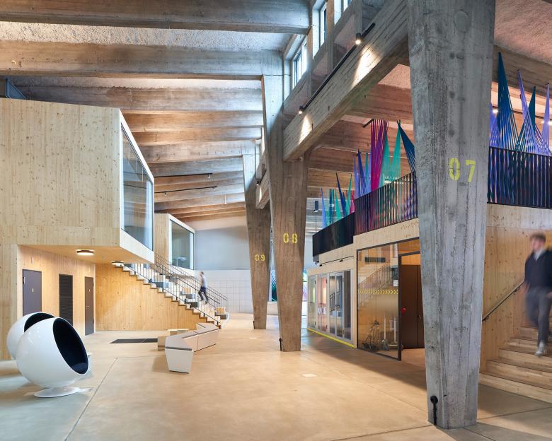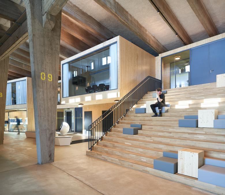 Die Holz-Kuben erhöhen die Ausnutzung der Bestandsfläche und schonen Oberflächenversiegelung. Das warme Holz und der Bestand ergeben eine großartige Symbiose aus Historie und Zukunft. Eine praktische und ästhetische Lösung, um die verschiedenen Funktionsbereiche innerhalb des Zentrums herzustellen. Neue Treppenräume und Freitreppen verbinden die Ebenen und laden zum Verweilen oder Kommunizieren ein. Im Sinne einer flexiblen Nachnutzung können die Mieteinheiten durch die Moduleinbauten jederzeit erweitert oder verkleinert werden.