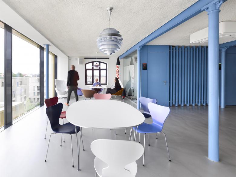 These meeting areas serve for communication and break with the conventions of classic office buildings. Here, members of staff from different units can gather together or meet clients.