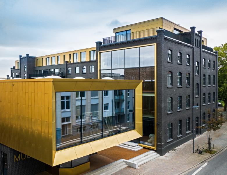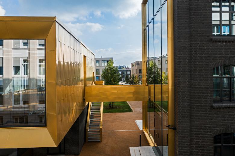 The character of the old, industrial main building has in part been preserved and in part deliberately disrupted. The entire building has been extended with a recessed additional floor. The old, undefined existing tiles were light in color but gave way to a dark, almost black brick with dark joins in brickwork that date back to 1897. Historical superstructures have also been reconstructed on the end of the building, and these contrast with the recessed additional story, which is clearly distinguished from the existing building in its design language and, most significantly, in its materials. Golden sheet-metal cladding serves as an eye-catching element.