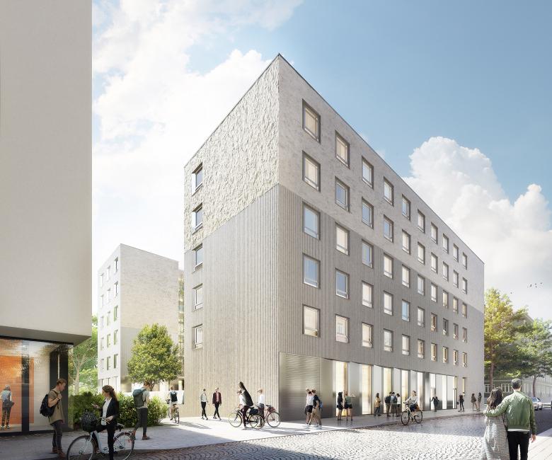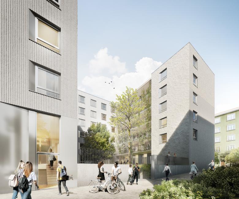 Da viele der Wohnplätze von Musikstudierenden bewohnt werden, gibt es neben Lernräumen spezielle Musik-Übungsräume. An zentraler Position, dem Hof zugewandt, entsteht ein Mehrzweckraum, der durch aluminiumverkleidete, schräge Fassadenelemente zum Blickpunkt wird. Entlang der Agnesstraße, an der sich der Haupteingang zum Studierendenwohnheim befindet, wird die Fassade ebenso hervorgehoben. Der restliche Baukörper zeigt sich in einer Putzfassade aus Grob- und Kammputz und bildet den bisher fehlenden Baustein eines Ensembles studentischen Lebens in einer gefragten und geschätzten Wohngegend.