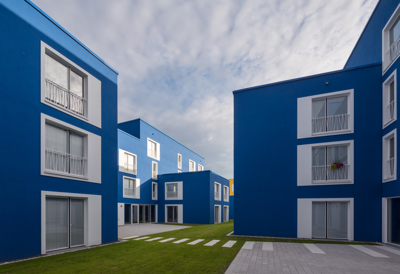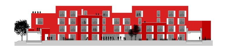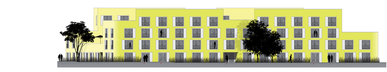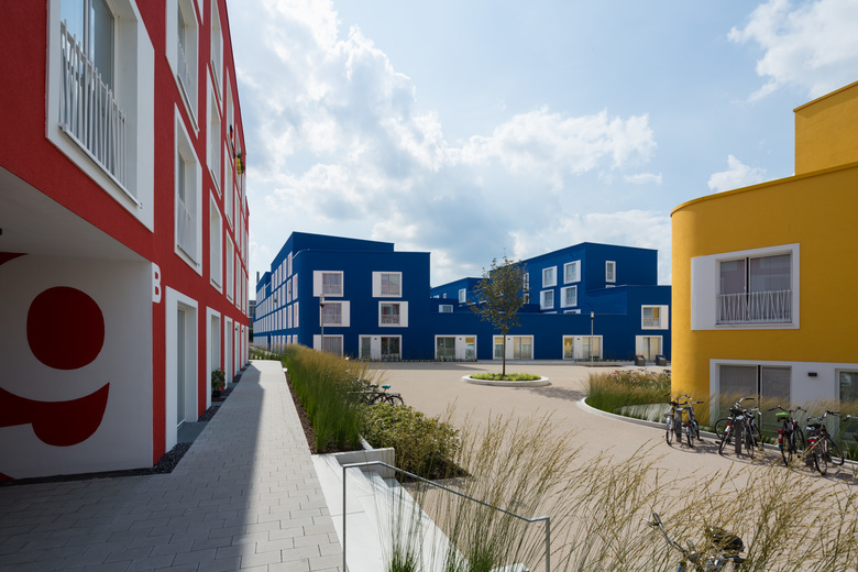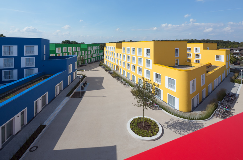 The complex of student housing erected at the Boeselagerstraße in the city of Münster takes up these ideas and, with a total of 535 residents on a living space of 18,000 m⇢ after all, creates a flowing, asymmetrically arranged urban space of its own which conveys an almost rural sense of security rather than having an intimidating effect.