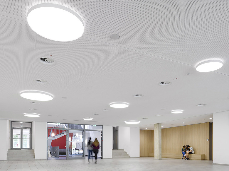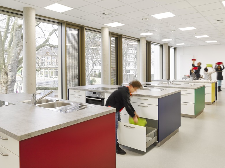 The jointly used areas in the new building of the foyer, cafeteria and dining rooms are communication areas for the entire ensemble. Large glass surfaces allow the connection of interior and exterior space and continue the bright and positive learning atmosphere in the new building.