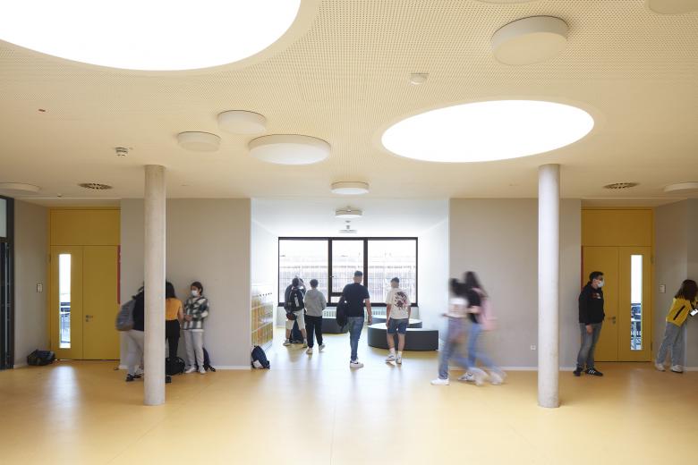 The main building is being renovated and reorganized. In addition to classes 8 to 10, music and theater spaces are housed here. A special centerpiece will be the open auditorium, which will be created by raising the roof structure to the second floor above and introducing a circular gallery. Thus, school-internal events with perfect acoustics will soon be possible here. During the planning, it was important to ensure that all rooms are barrier-free, that there is a healthy climate in the classrooms and that enough light is available. The pupils can also look forward to additional places of retreat and workplaces in addition to the usual classrooms: In the existing building, the gallery and in the expansion building the corridor zone offers a multifunctional usable area. Due to the location of the extension building, a central courtyard is created between the two buildings and the existing sports hall, which can be used as a school campus or educational outdoor area. An additional parking space for cars completes the extension. However, the students and teachers still have to be patient for a bit: in early 2022, the building should be finished. But anticipation is known to be the greatest pleasure.