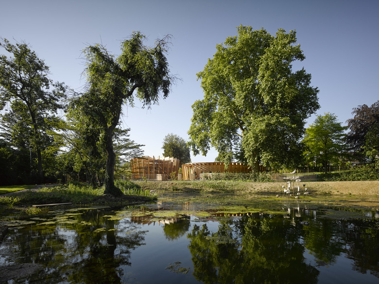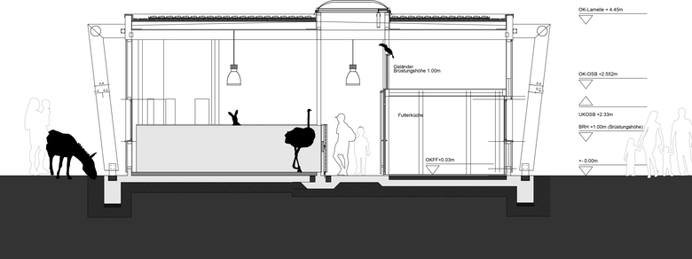 In this manner, the three elements emerge very much as a whole, yet still appear subdivided and delicate in the natural surroundings. In addition, the lamellar-like facade of the aviary and stable reinforces this vivid effect and lends a second level of complexity and depth to the ensemble. Furthermore, the appealing nature of the buildings is adjusted to the eye level of children and should serve as an inviting place to visit and spend time.