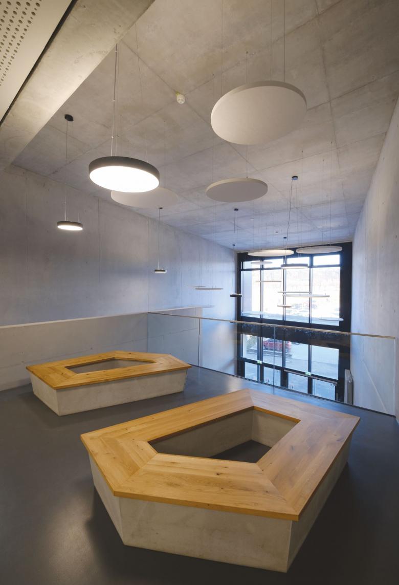 Der ausdrucksstarke, mehrfach gefaltete 2-geschossige Baukörper besetzt das Grundstück großflächig und markiert den Ortseingang von Weilheim als Solitär.