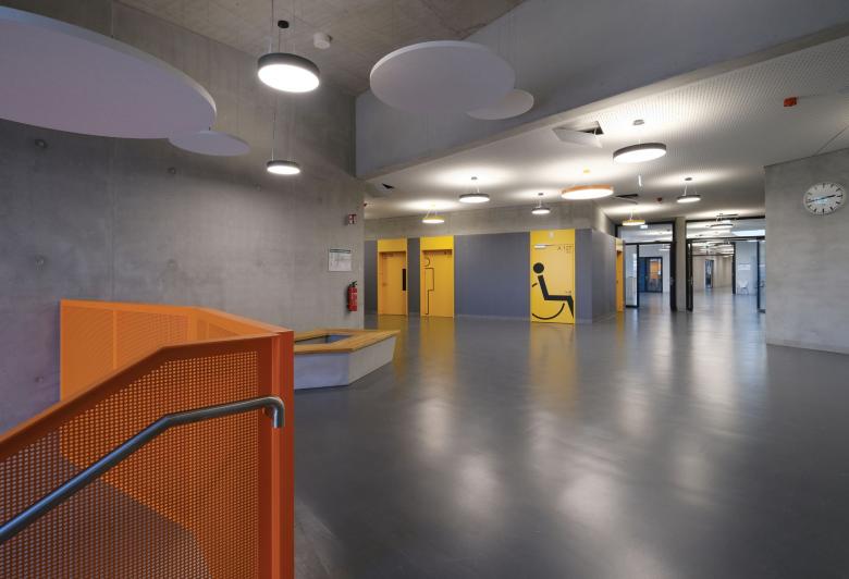 Die Haupterschließung erfolgt über den Vorplatz, an dem die zentralen Bereiche wie Mensa, Aula und Verwaltung untergebracht sind. Von dort erfolgt die witterungsgeschützte Erschließung aller unterschiedlichen Fachbereiche in die östlich bzw. westlich gelegenen Werkstattbereiche. Im Obergeschoss befinden sich vorwiegend Klassenzimmer und IFUs (Integrierte Fachunterrichtsräume), im Erdgeschoss die Werkstätten, Bau-, Kraftfahrzeug- und Lagerhallen.
