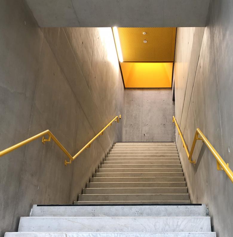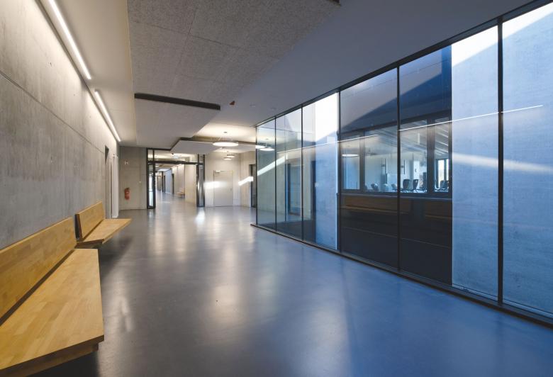 Zwei Atrien belichten und belüften die mittigen Bereiche und gliedern in Verbindung mit den Treppenknotenpunkten die bis zu 180 m langen Flure in überschaubare Einzelabschnitte.