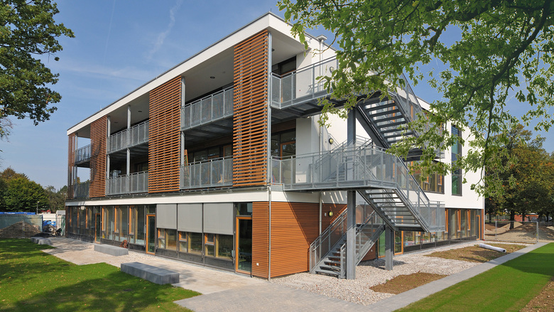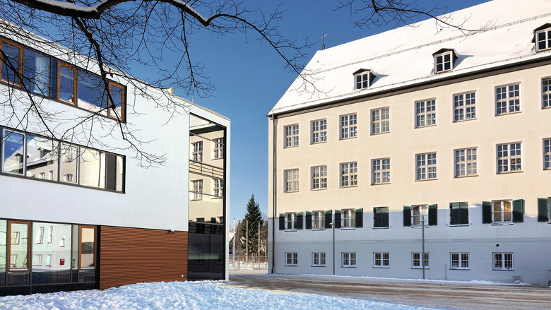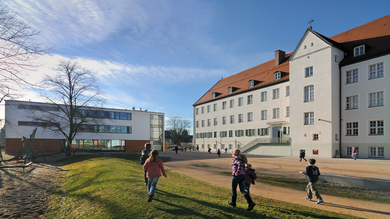 Eine Nutzungserweiterung mit sieben Klassen sowie ein sechsgruppiger Hort befinden sich in einem ruhigen dreigeschossigen Kubus im rückwärtigen Grundstück.