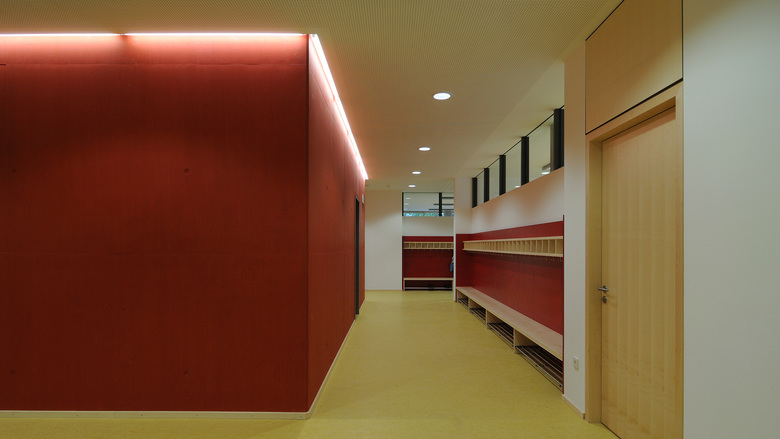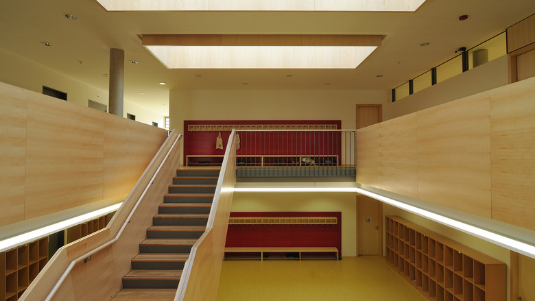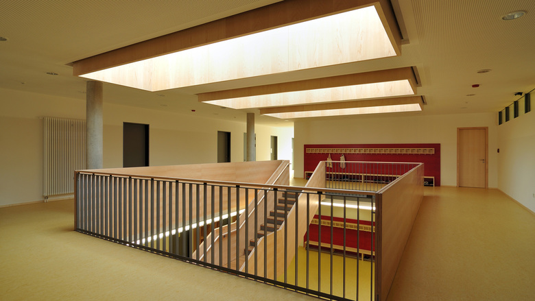 Um eine zentrale Halle mit großzügigem Luftraum und Oberlicht gruppieren sich an der Südseite die Horträume mit Bezug zum begrünten Außenraum. Der Pausenhof wird so von Neu- und Altbau eingerahmt sowie mit hochwertigem Bestandsgrün ergänzt.