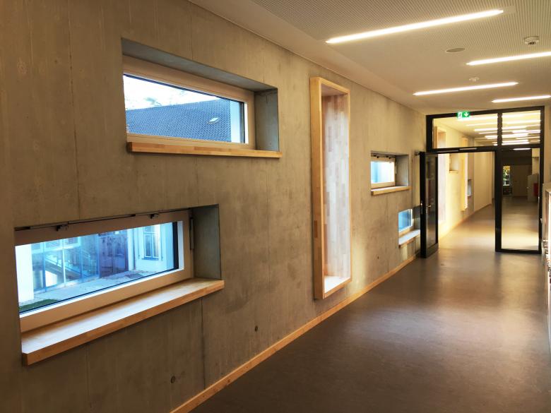 Der 2-geschossige Riegelbau ist zum zentralen Vorplatz im Ensemble von Grundschule, Förderschule und Mittelschule ausgerichtet. Er verleiht der Grundschule ein neues, einladendes sowie modernes Gesicht.