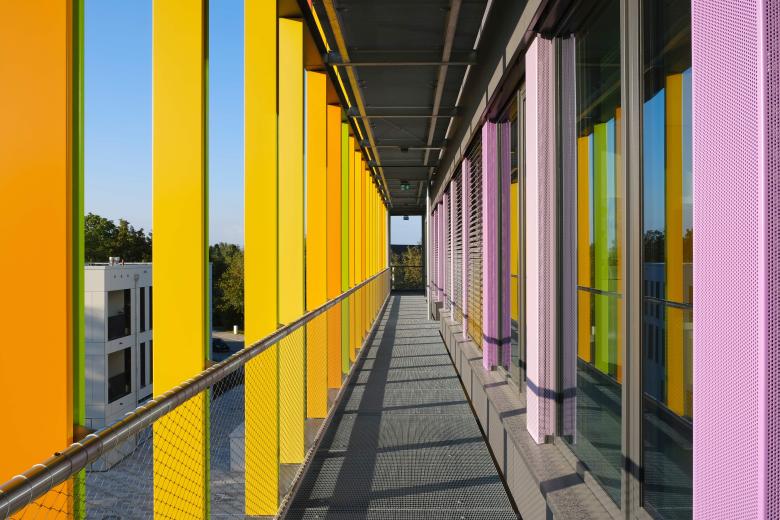 Das viergeschossige Grundschul- und Mittelschulgebäude sowie die niedrigere Sporthalle werden auf dem beengten Grundstück als kompakte Solitäre in die bestehende Parklandschaft eingefügt, mit größtmöglicher Distanz des Schulgebäudes zur kleinteiligen Nachbarbebauung. Der Hauptzugang zum Schulgrundstück erfolgt nördlich über den öffentlichen Vorplatz von der Rockefellerstr., ein zweiter Zugang südlich von der Parkseite. Grund- und Mittelschule als eigenständige Einheiten mit jeweils viergeschossig übereinander angeordneten Lernhäusern in den Kopfbereichen der Schule, jeweils eigenem Zugang und eigener vertikaler Erschließung. Lernhausmitte als Multifunktionsraum für flexiblen Gruppen- oder Einzelunterricht. Separate Sanitär- und Abstellräume je Lernhaus. Außenliegender Fluchtbalkon ermöglicht flexible Möblierung und Nutzung der Lernhausmitte. Gemeinsame Mitte für beide Schulen ist die zweigeschossige Aula (für ca. 775 Pers.) mit Mensa.