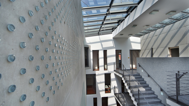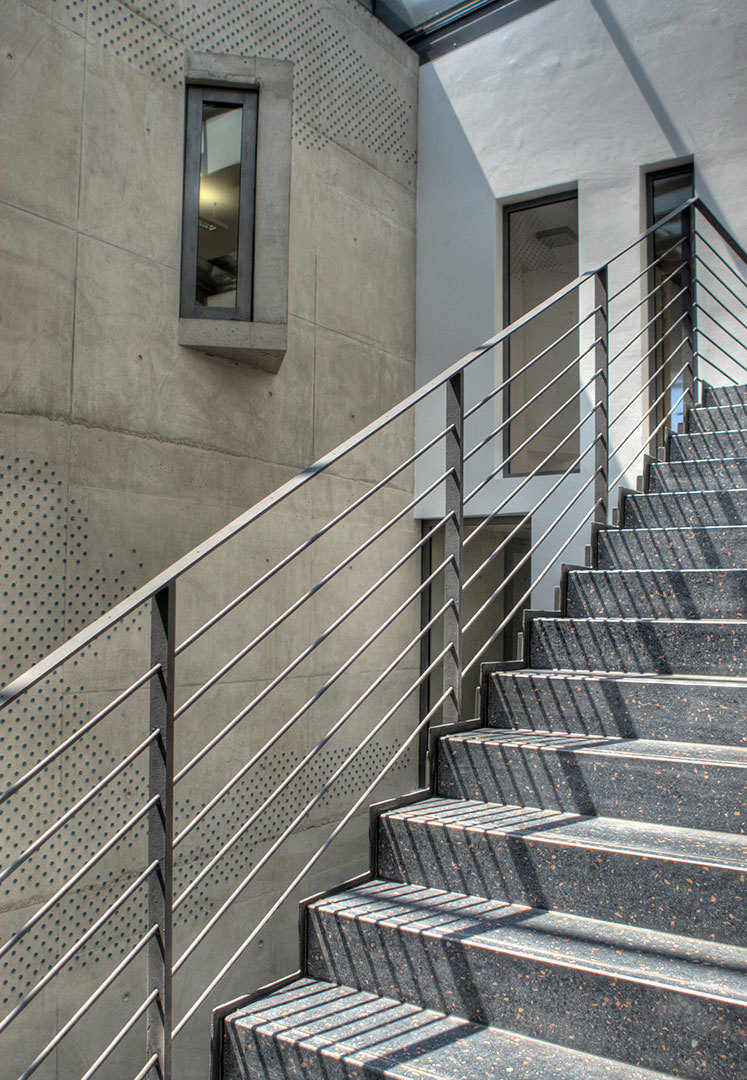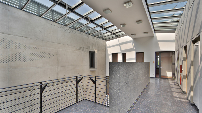 Die Gestaltung des Dachgeschosses ermöglicht einen umlaufenden Freitritt, der nicht nur das Personal zu kleinen Pausen einlädt. Durch das Zurückweichen der Fassade wird hier die Höhenentwicklung gemildert und eine horizontale Gebäudewirkung erzielt. Die Büroräume selbst sind ringförmig um den zentralen Kern mit einer lichtdurchfluteten Treppenhalle mit Glasoberlicht angeordnet. Zusammen mit den Nebengebäuden umschließt das Verwaltungsgebäude den ansprechend gegliederten Polizeihof. Die erdgeschossigen Nebengebäude sind konstruktiv wie das Verwaltungsgebäude ausgeführt, hier finden die Kfz-Wasch- und Wartungshalle und die Raumschießanlage ihren Platz. Das angrenzende offene Parkdeck mit zwei Ebenen hält die Stellplätze für die Dienst- bzw. Bediensteten-Pkw bereit.