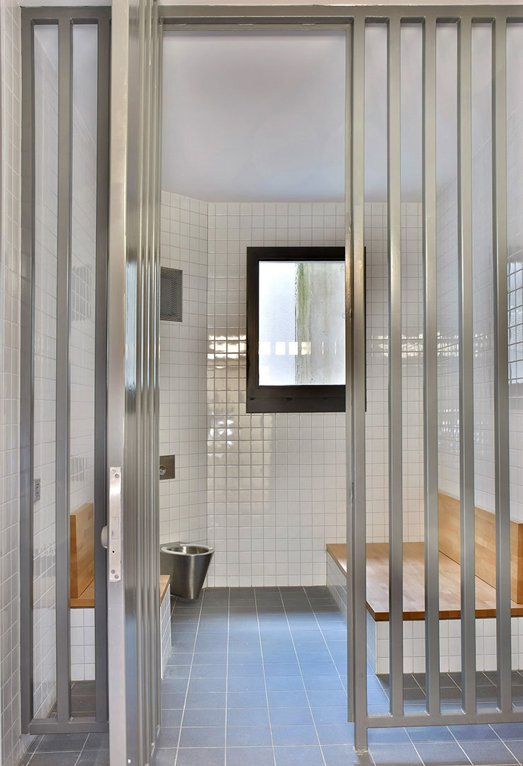 Die neuen Polizeibauten mit ihrer zurückgenommenen Farbigkeit wirken sehr angemessen freundlich und gliedern sich nahtlos in das Ensemble mit dem Wasserturm im Süden und dem Finanzamtsgebäude im Norden ein. Einige wenige Farbtupfer im Inneren, wie die Umrahmung des Fensters zur Wache im Windfang, die farbige Wand in der Treppenhalle und der Linoleumboden in Fluren und Büros steigern die harmonische Gesamtwirkung der Gebäude.