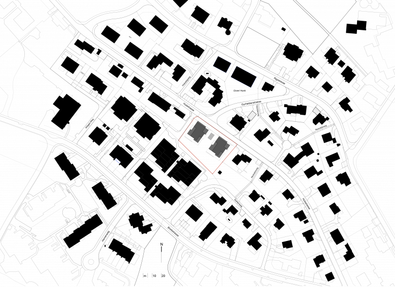 Die Erschliessung des gegen Südwesten abfallenden Grundstückes erfolgt von oben ab der Hubstrasse, weshalb eine Setzung der beiden Gebäude am oberen Rand entlang der Strasse naheliegend ist. Mit der maximalen Höhenlage konnte die Aussicht optimiert und der Grünraum gegen Südwesten gross gehalten werden.