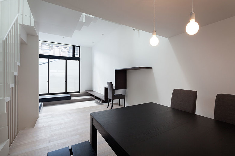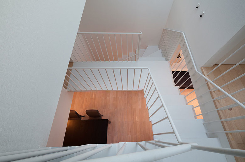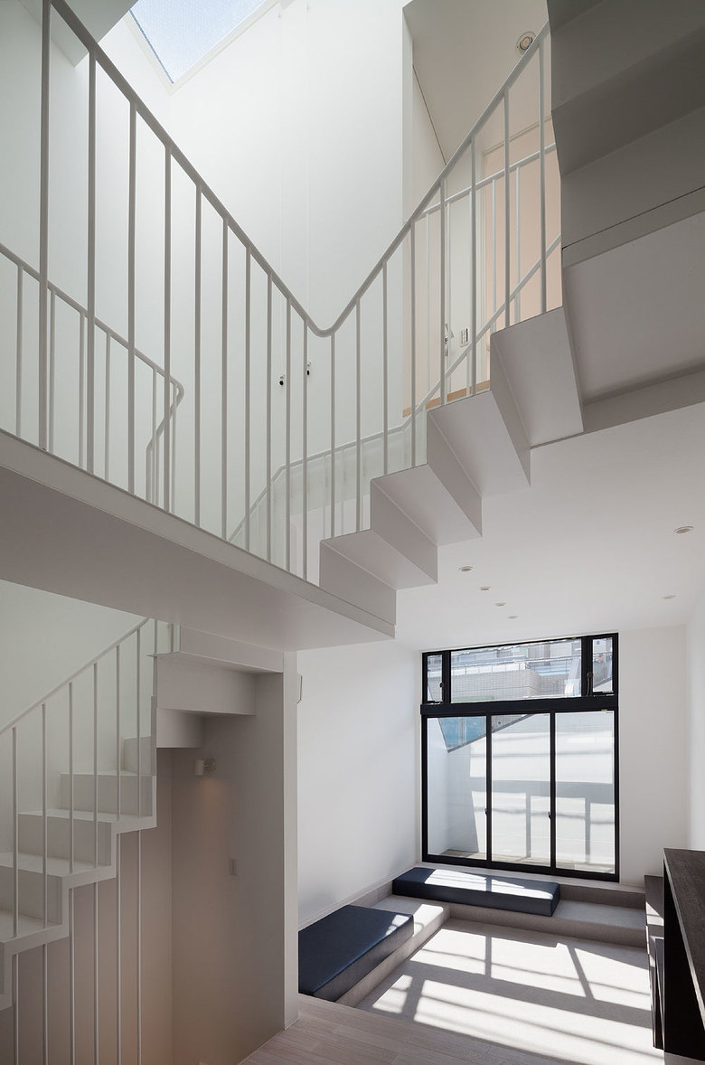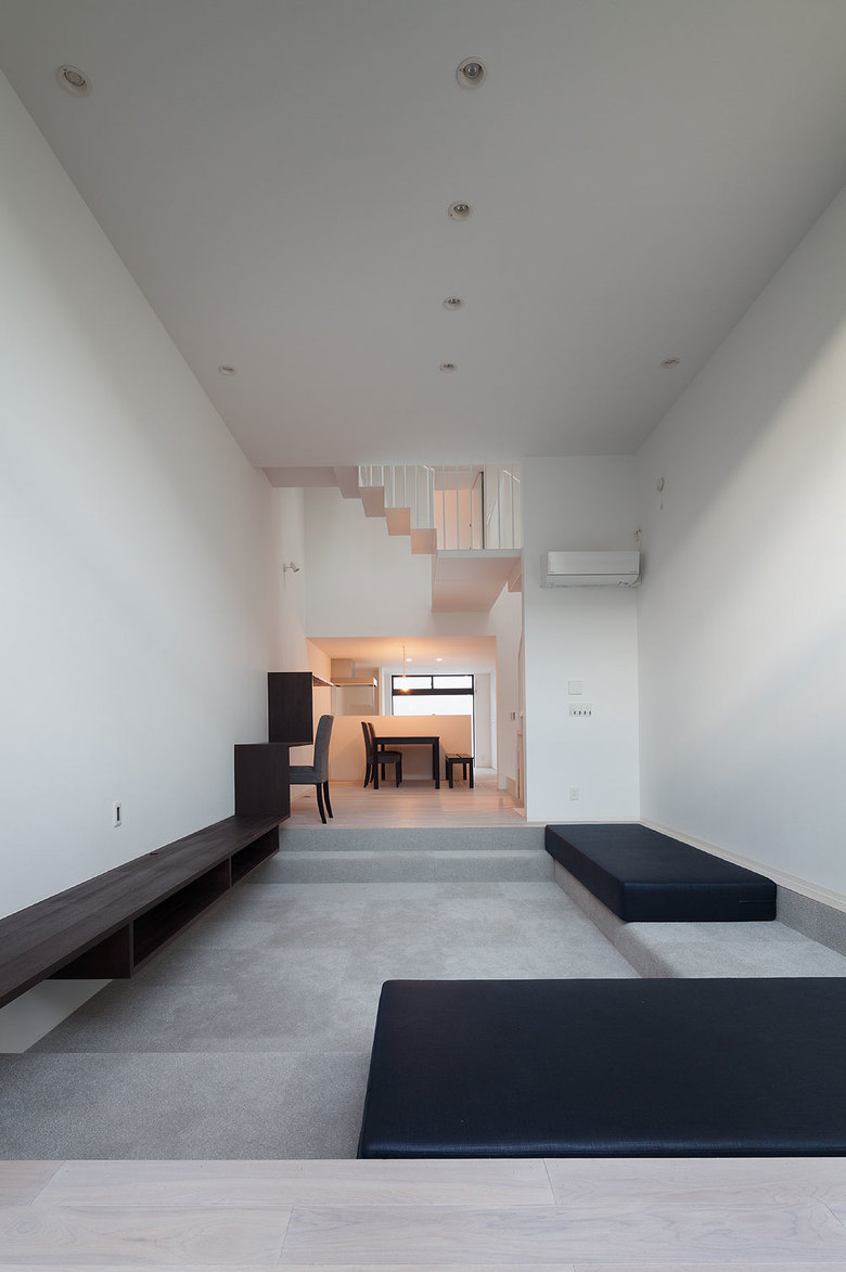 The design makes optimum use of a long, thin building site with a 3.6-meter frontage. While conveying a sense of freedom and relaxation, the space allows residents to maintain their privacy but still feel connected to the outside environment. The living-dining-kitchen area, aligned north-to-south, is varied and lively thanks to a ceiling that is high in the living-room area but lower in the dining area. A skylight between the two sections brings sunlight into the center of the space and gently divides it.