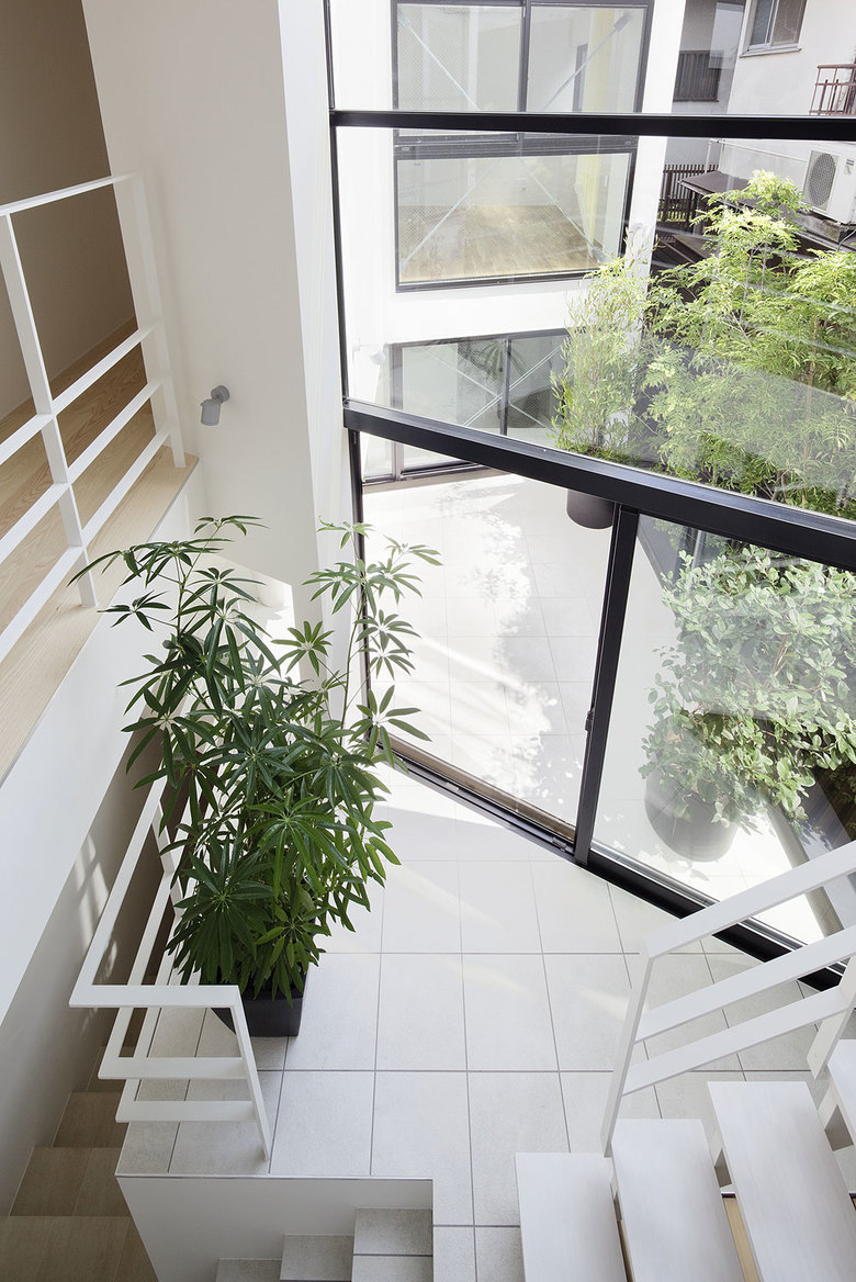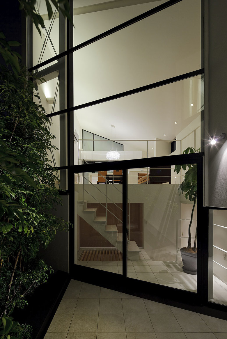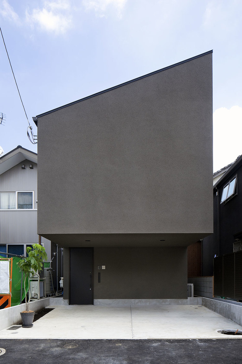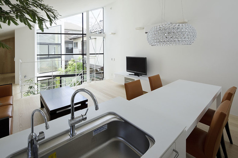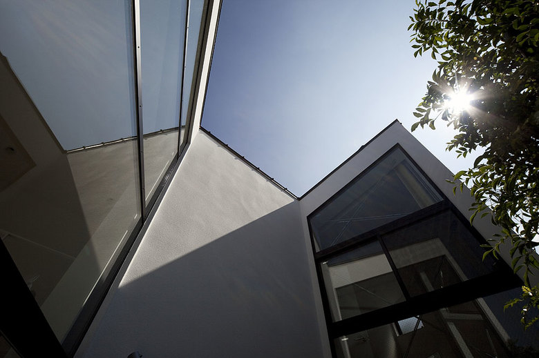 A 3.3-meter cantilever juts out over the entryway of this house, which has no windows in its façade. In contrast, a south-facing, V-shaped courtyard cut into the center of the structure lets in air and light. One has a sense of connection to the natural world in every part of the home.