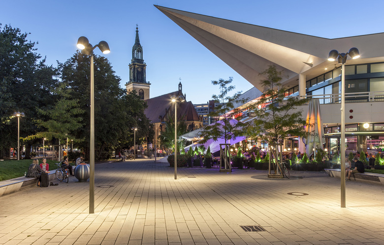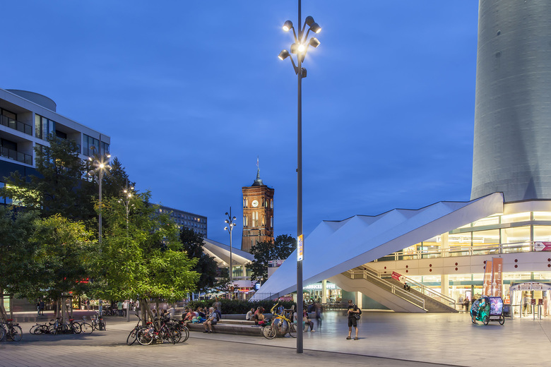 The urban space around the television tower at Alexanderplatz is one of the most prominent and frequented locations in Berlin and has been reinterpreted and redesigned by the landscape architects Levin Monsigny. The careful transformation of the urban landscape, all while considering its existing design, central location, and the GDR history, has produced a modern, functional plaza with high urban significance. The lighting concept supports this high intensity usage by heterogeneous user groups, while supporting the diverse gathering areas with different lighting atmospheres. The lighting is carefully attuned to the landscape concept and offers a high quality visitor experience. In addition, this urban plaza has received a new, friendly identity, which is inviting both as a lingering spot and for lively gatherings.