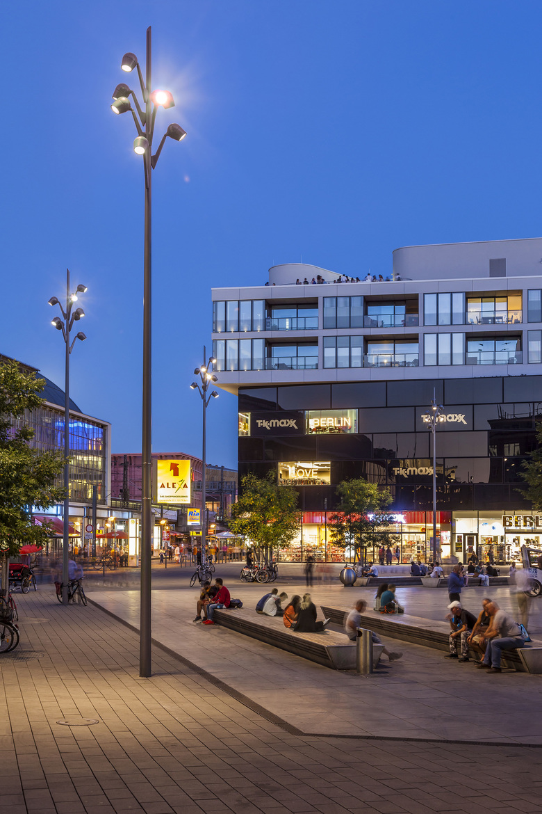 The leitmotif for the lighting concept is, on one hand, the well-being and safety of the users alongside a clear orientation and indication of prominent points during the evening hours. On the other hand, the reality that green areas are generally not highly illuminated in Berlin has been taken into account – as the areas “city park” and “city garden” are both defined as green areas. For all remaining areas, well-shielded fixtures with directional light define the nighttime image while circumventing disturbing sources of glare. Furthermore, the entire site is connected through a consistent luminaire design vocabulary, thereby avoiding a wide diversity of luminaire and lamp types.