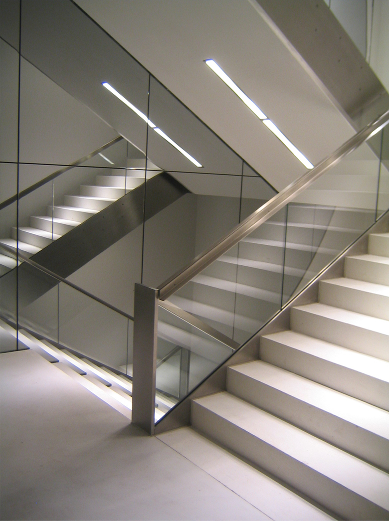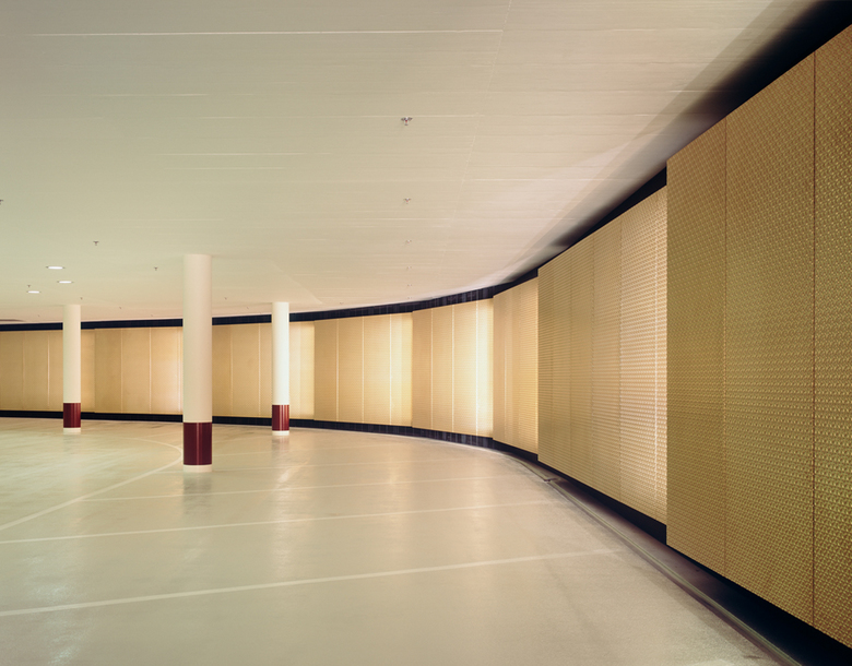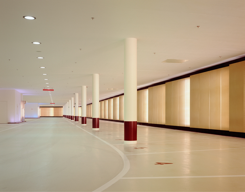 The reconstruction of the main entrance area has resulted in a new reception building and underground car park breathing lightness and transparency while supporting the company’s corporate image. The reception building, a glass pavilion with a ´floating´ roof, welcomes visitors. Ultimate transparency appears at night as the glass panes become invisible and the white roof is enhanced by the up-lights integrated in architectural elements. Arriving by car implies an extraordinary parking experience. The symbiosis of light and architecture structures the space, allowing a minimum of distracting elements and creating a feeling of safety and lightness.