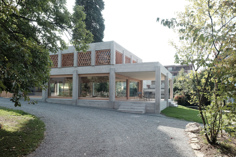 Als Ersatz für das ehemalige Waschhaus vermittelt das neue Gemeinschaftshaus zwischen der steinernen Villa im Neurenaissancestil aus dem Jahre 1880 und dem 1995 erbauten hölzernen Wohnhaus. Während die steinerne Struktur des Skelettbaus Offenheit und Öffentlichkeit signalisiert, strahlt der hölzerne Ausbau Wärme und Geborgenheit aus. Die rohen unbehandelten Materialien wirken durch ihre ausgeprägte Haptik sehr sinnlich und werden dadurch als selbstverständlicher Teil des Gartens wahrgenommen.