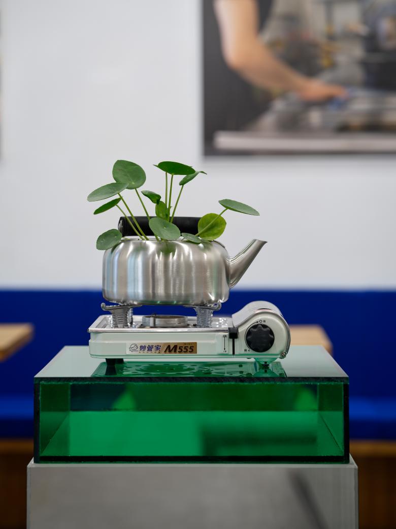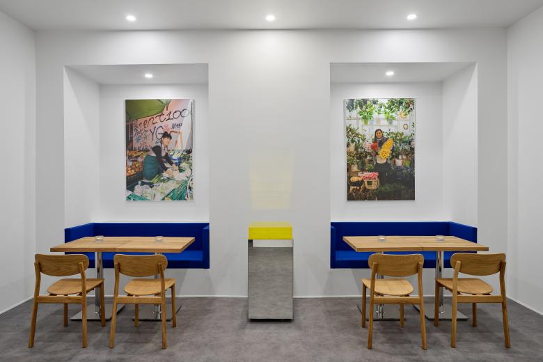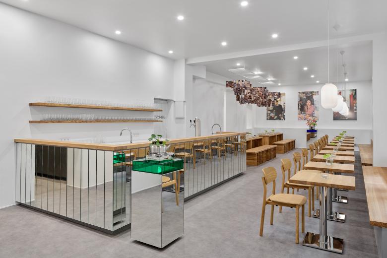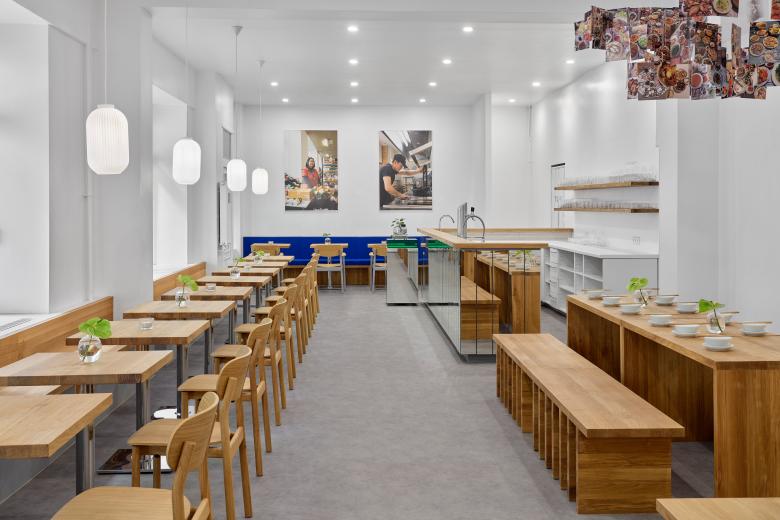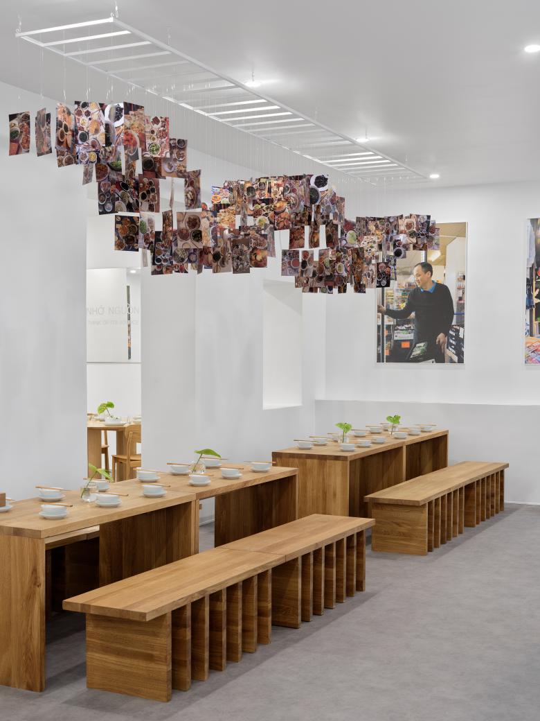 With a clear and minimalist approach, the NHÀN restaurant deliberately avoids Vietnamese folkloric elements. Instead, specially created installations are used in a new and playful context. Typical everyday Vietnamese household items are repurposed and highlighted as decorative elements on showcases. The wavy ceiling installation as a composition from various photographs of traditional Vietnamese dishes provides an insight into Vietnamese food culture. As a sharing concept, the authentically prepared dishes are served as tapas in simple bowls.