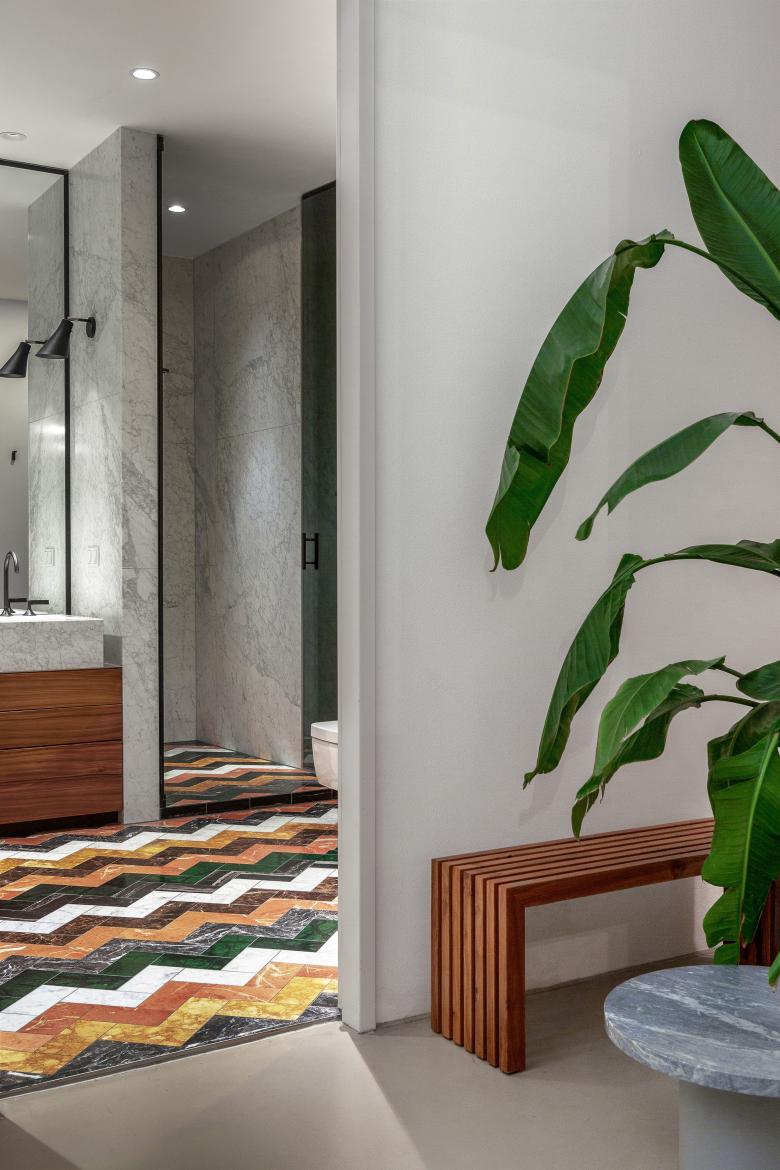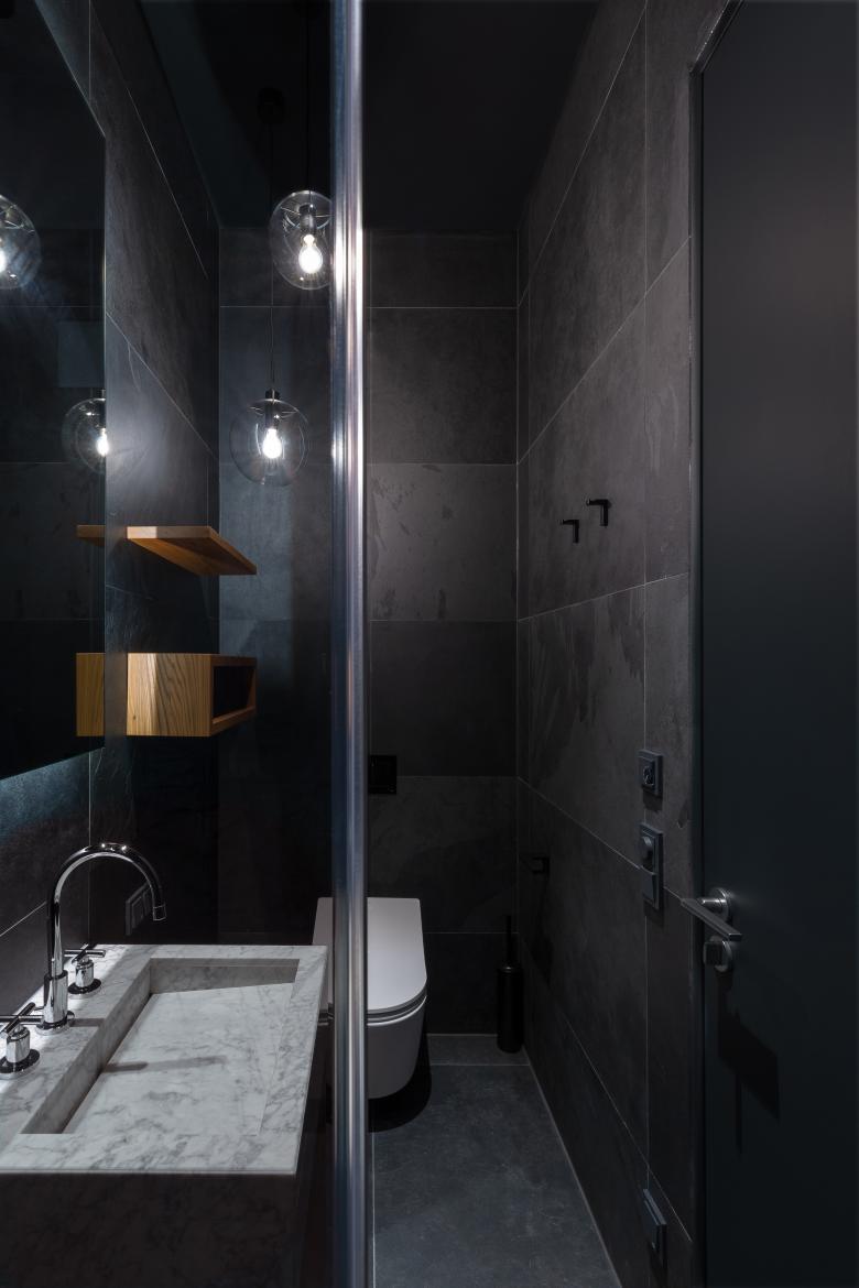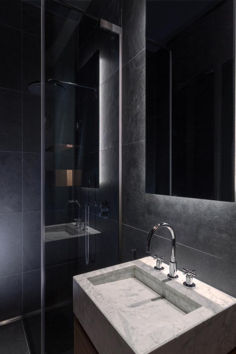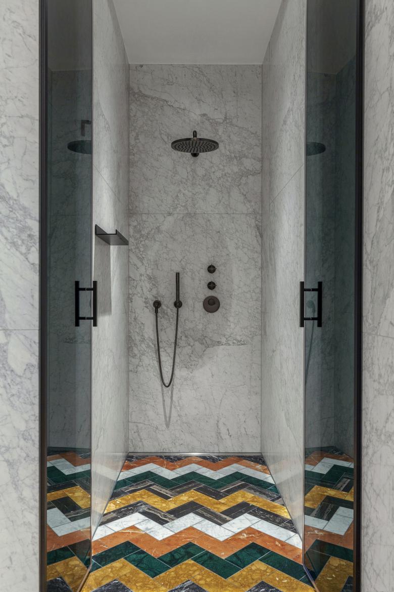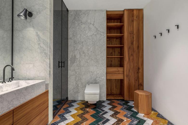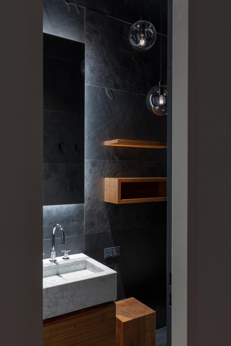 Pure luxury: there is a touch of Hollywood glamour in this rebuilt loft in Berlin. As requested by the clients, originally from Los Angeles, these bathrooms exude sophistication with their fancy design. The beauty of natural stone in all its facets plays the starring role. With its unique grains and subtle details, stunning white Italian marble lines the walls from top to bottom with matching high-end washbasins. This versatile natural stone with its richness of colors also decorates the floor in a distinctive wave pattern. Bespoke elm wood furniture and stylish fittings in dark platinum round off the engaging scene.