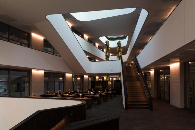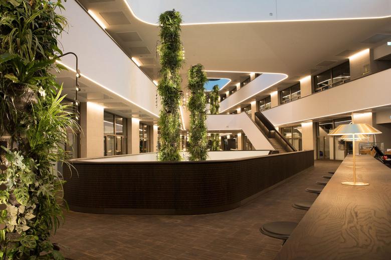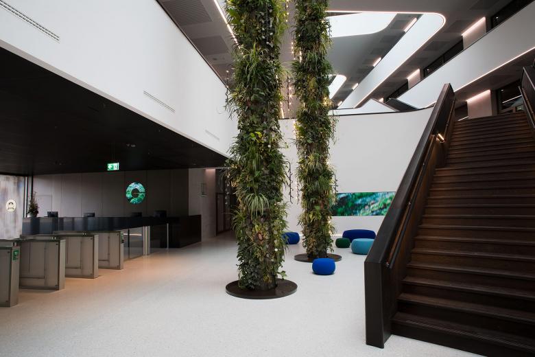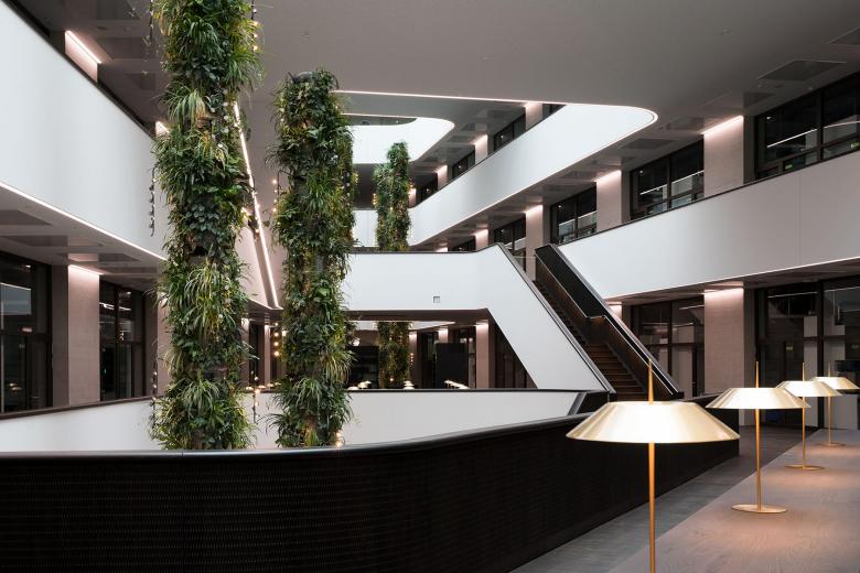 On the industrial historically significant area of Maggi, the flavour and fragrance manufacturer Givaudan extends its research center. It creates space for 290 jobs in the field of research and development. The new laboratory buildings surround an atrium that serves as a common space for encounters and exchanges. Execution is carried out in accordance with the sustainability standard «LEED Gold», to meet strict sustainability requirements for resource-efficient construction and low operating costs. Another highlight of the Innovation Center are the 12m green columns with ornamental plants. That the plants thrive healthy indoors a special luminaire was designed following the biophilic approach and providing the right light spectrum.