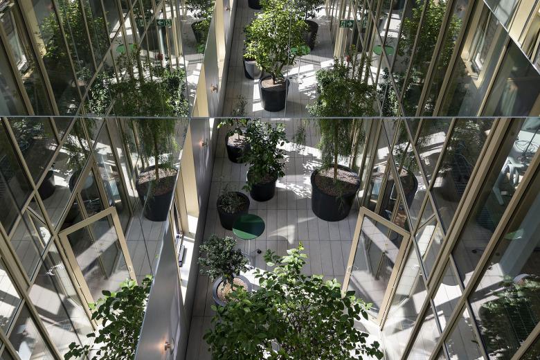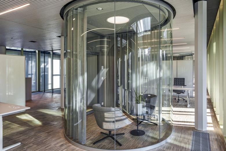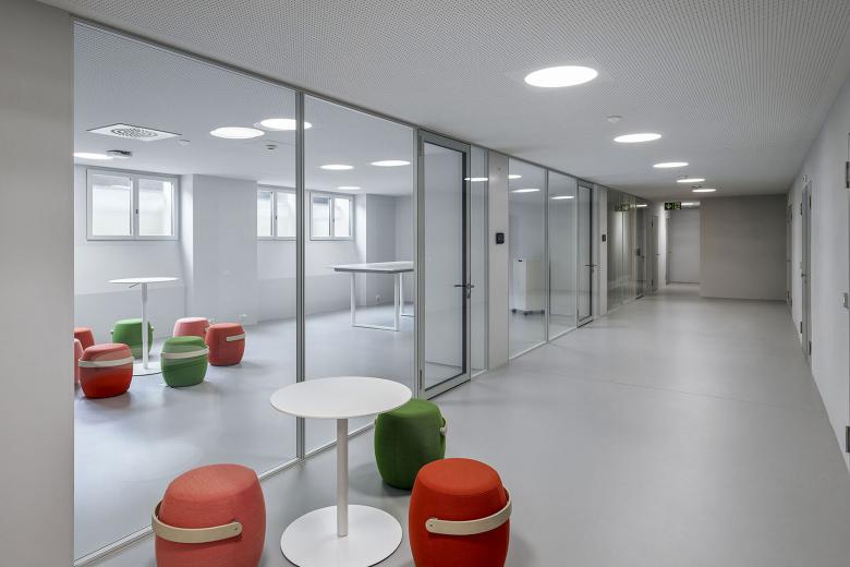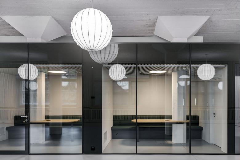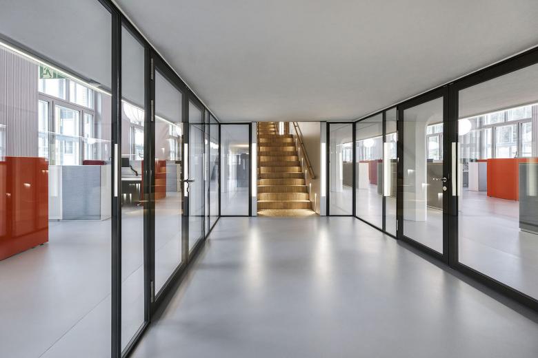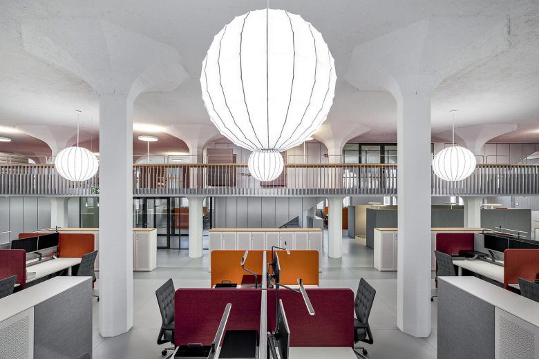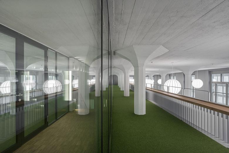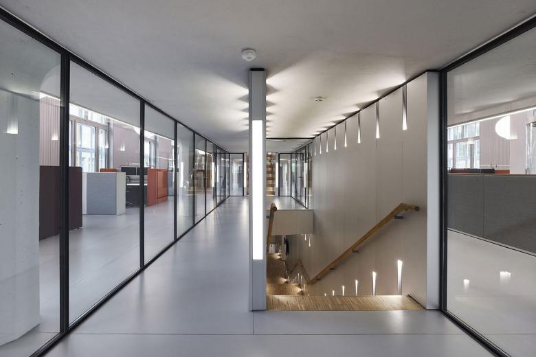 On the site of the former Maggi factory in Kemptthal, an office building with 200 workplaces was built in an existing and heritage protected environment. A two-story extension accommodates the cafeteria and two orangeries as social meeting places and as an executive floor. Considering the aspects of the "human office", an own office concept and acoustically active lighting-design was developed with tunable-white pendants as homage to history. Furthermore, a solution for the unique sculptural staircase-ensemble was developed, which was integrated into the existing building as a connecting element. The embedded staircase-ensemble serves as light carrier, since the historic building substance did't allow mounting possibilities for the lighting. Wall luminaires for direct and indirect brightening of the access zone are used for their illumination. An indirect wall light position optimizes the spatial impression of the squat room height of the mezzanine area, while vertical light bands improve the basic illumination of the passageways. The use and material structuring of the building are specifically supported by the selection and gradation of the light fixtures and color temperatures.