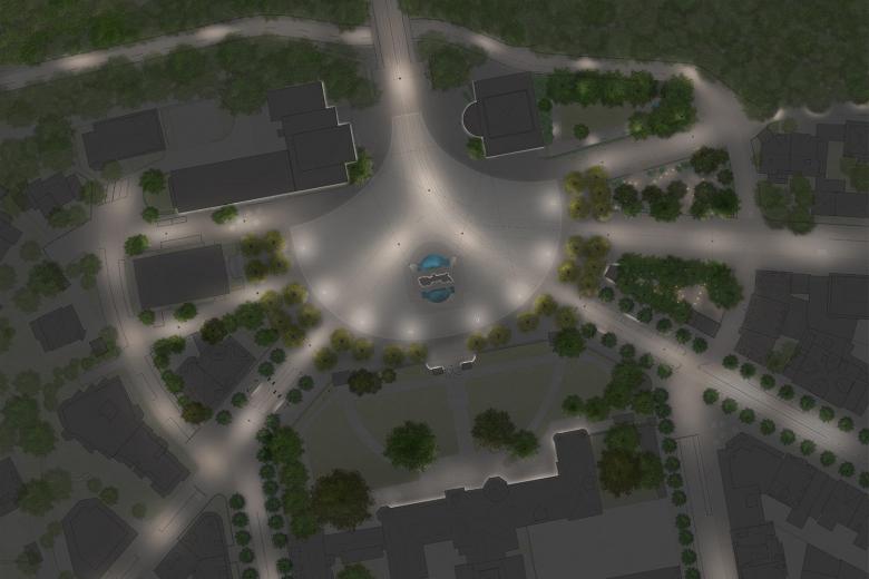The axes originating from the place are kept. The design is based on the design language of the carpet-like flooring, the placement of the radially arranged lighting candelabra and the precise completion of the double tree row from Krimlinden