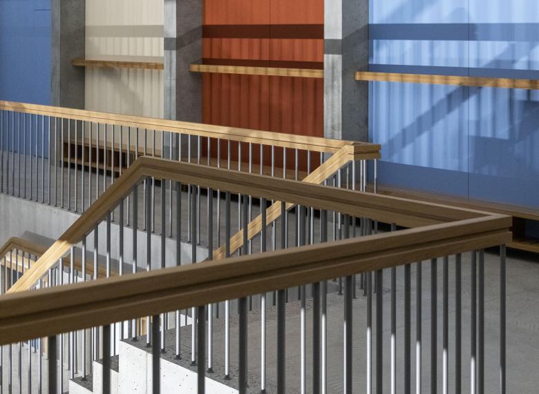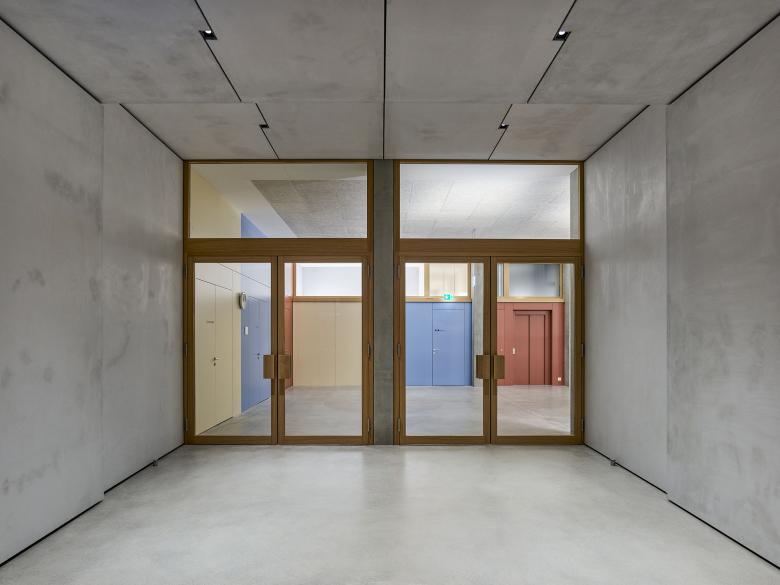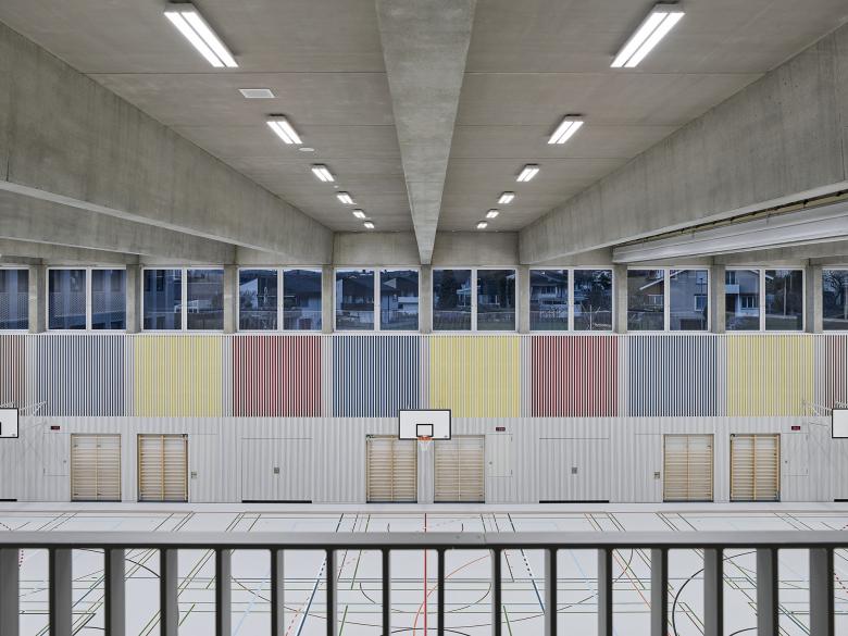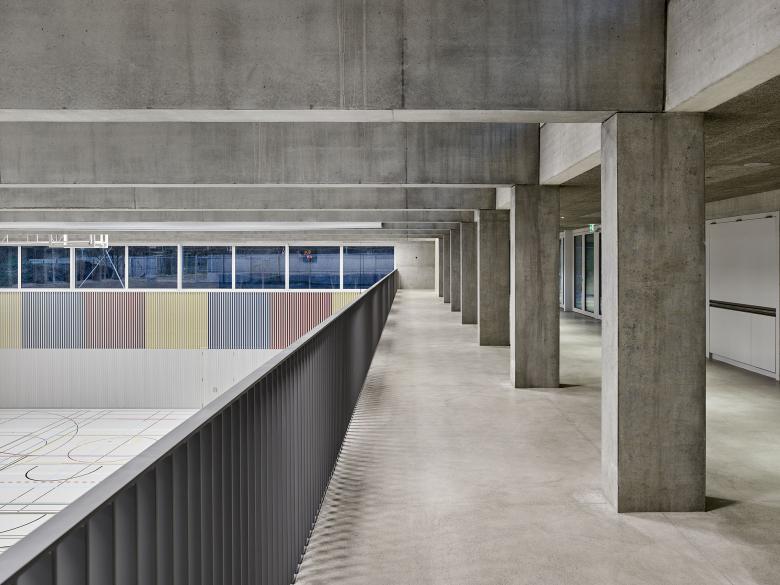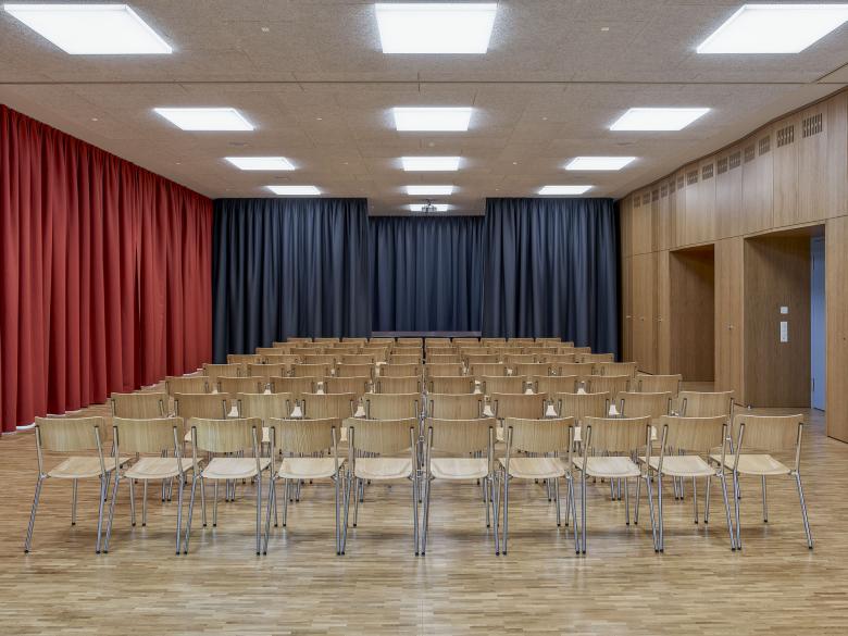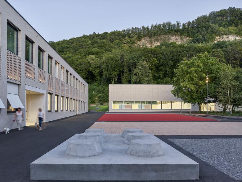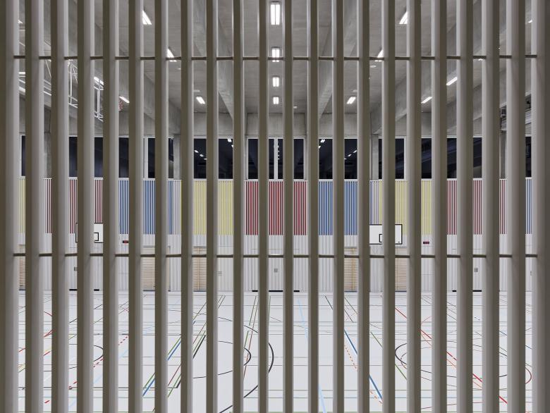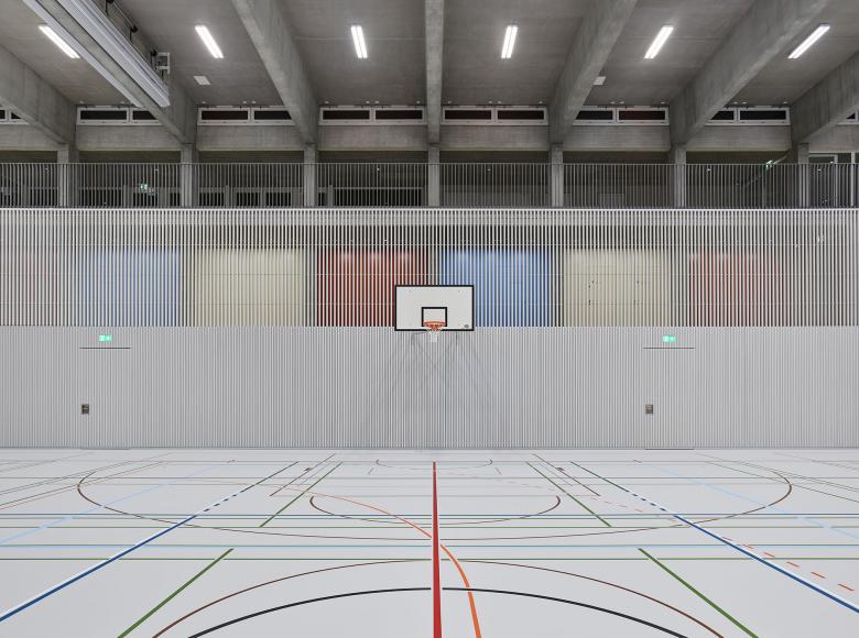 The existing Weissenstein school complex was expanded with a new school building and a dual gymnasium. The school building defines itself as the "school living space" - with classrooms, kindergarten and auditorium. All areas can be operated individually or jointly and share in a central interior, the two-storey school hall. The two floors are connected by a freestanding multifunctional staircase furniture. Thanks to the coordinated fire protection concept, the school hall can be used and furnished completely for educational purposes, thus offering the opportunity to include the architectural concept in the lessons. The gymnasium is integrated into the existing sports complex thanks to its precise topographical positioning. A representative entrance with a two-storey foyer connects the level of the halls with the level of the additional bleachers at the level of the outdoor sports facilities.