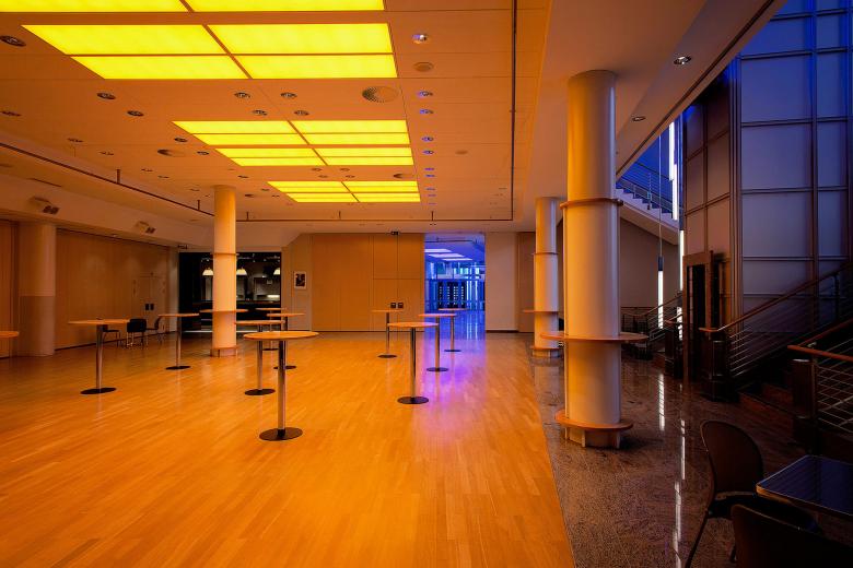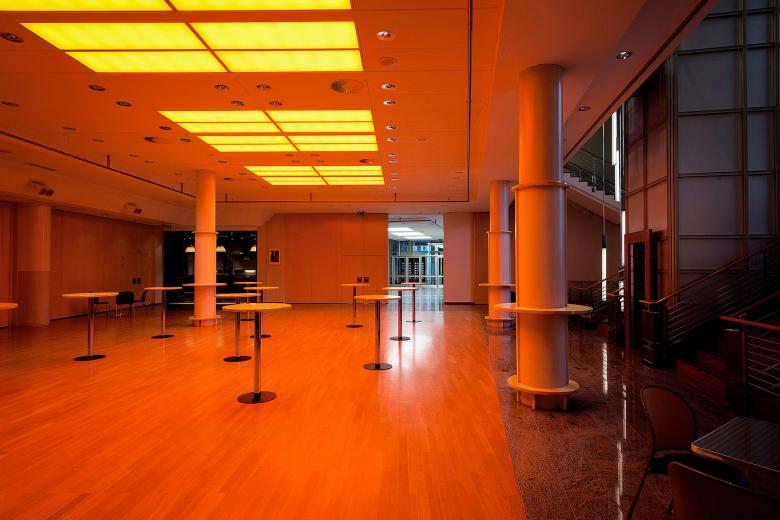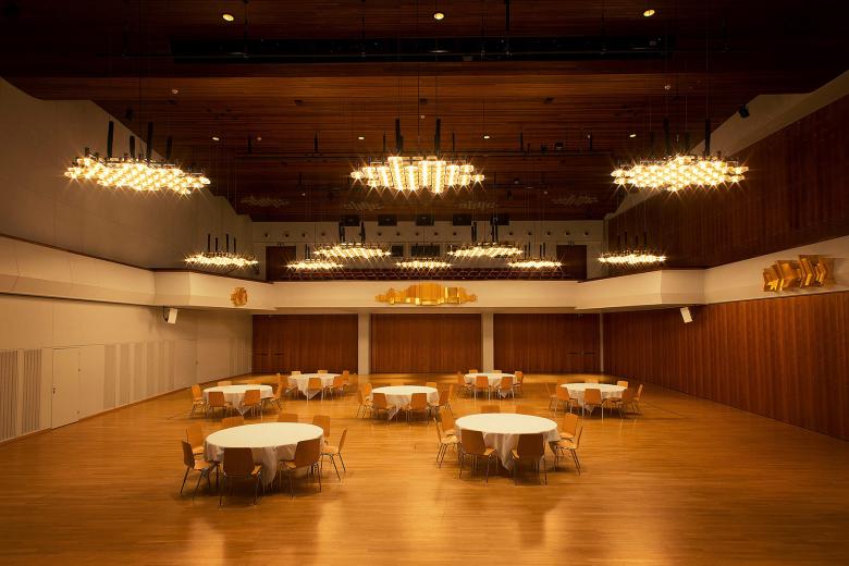 Located right in the centre of Vaduz the Vaduzersaal is ideal for large events, seminars, exhibitions and conferences. Since the original lighting system could no longer meet the growing requirements and in particular the energy efficiency standard of the municipality, the entire lighting within the public areas was restored. Highly shielded LED downlights combined with the custom made light panels and an intelligent control system create a new kind of flexibility. Parts of the acoustic-cooling ceiling were replaced with light fields. The fitting principle of the ceiling panels was reverse engineered for a smoothly integration of the light panels within the ceiling. Predefined light scenes and simple color selection buttons on the control panels centralized in the building provide the right ambience for any occasion. The existing chandelier in the main hall are the heart of the Vaduzersaal. The replacement of diffuse light bulbs with LED-filament lamps could enhance the quality of the cast glass structure by safing over 80% of the previous energy consumption. Additionally installed light lifts now allow to lower the chandelier on a human scale, which is appreciated especially for festive occasions.
