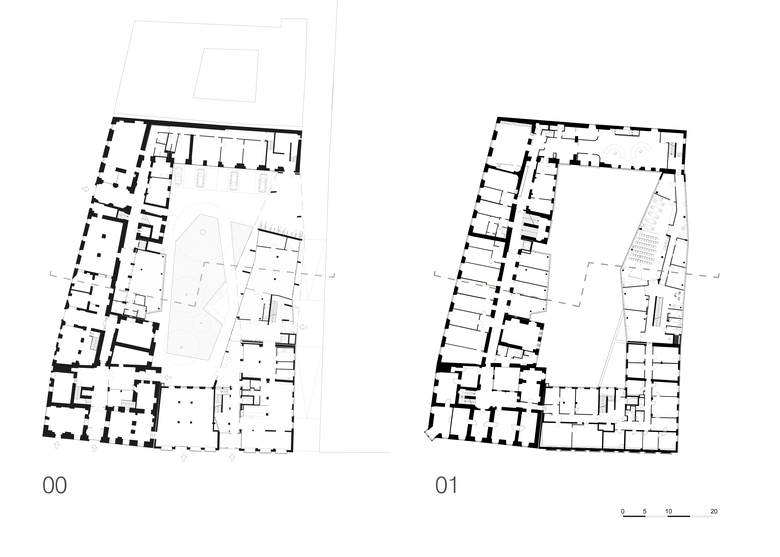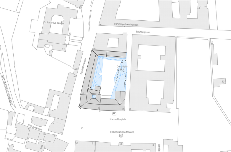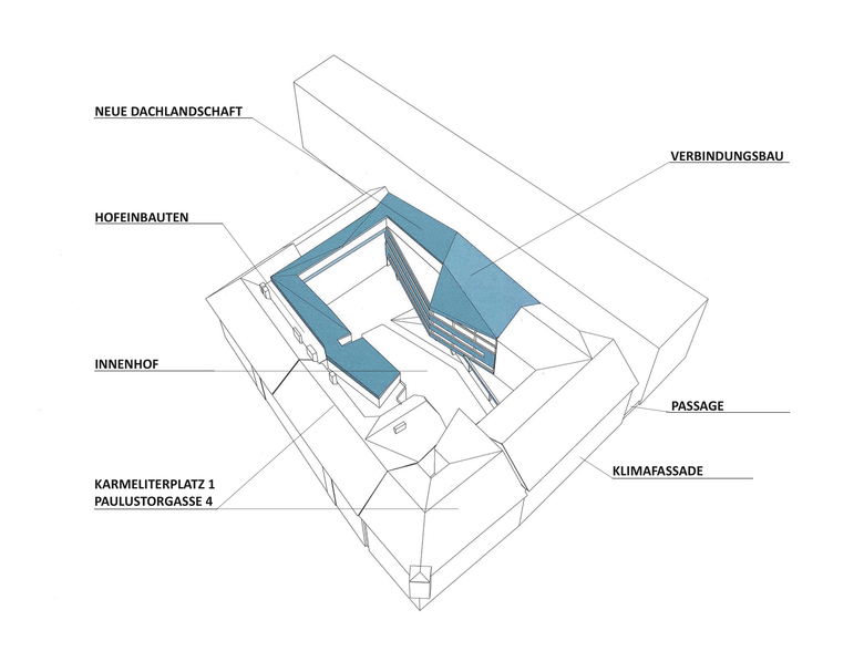 The previous alterations and additions were removed from the valuable Paulustorgasse 4 and Karmeliterplatz 1 buildings, thereby exposing the historical structure and restoring the original room layout to the greatest possible extent.